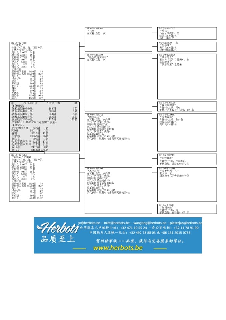 自身荣获:3-5-8-11名平辈顶级雌鸽“阿兰娜”获得:2次1名亚精顿国家赛23260羽26名平辈获得:亚精顿国家赛16490羽7名100%吉瓦特-兰努