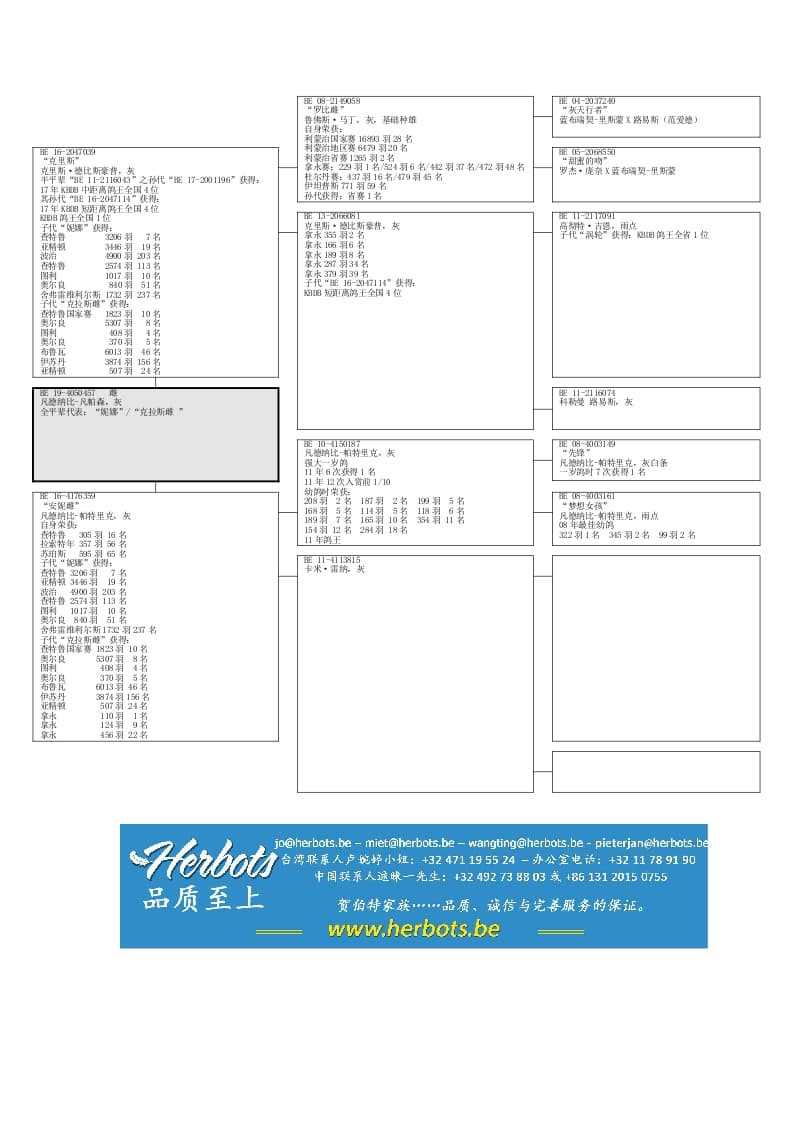 全平辈顶级雌鸽代表及佳绩:“妮娜”/“克拉斯雌”查特鲁省赛7名/奥尔良省赛8名/查特鲁国家赛10名/亚精顿省赛19名