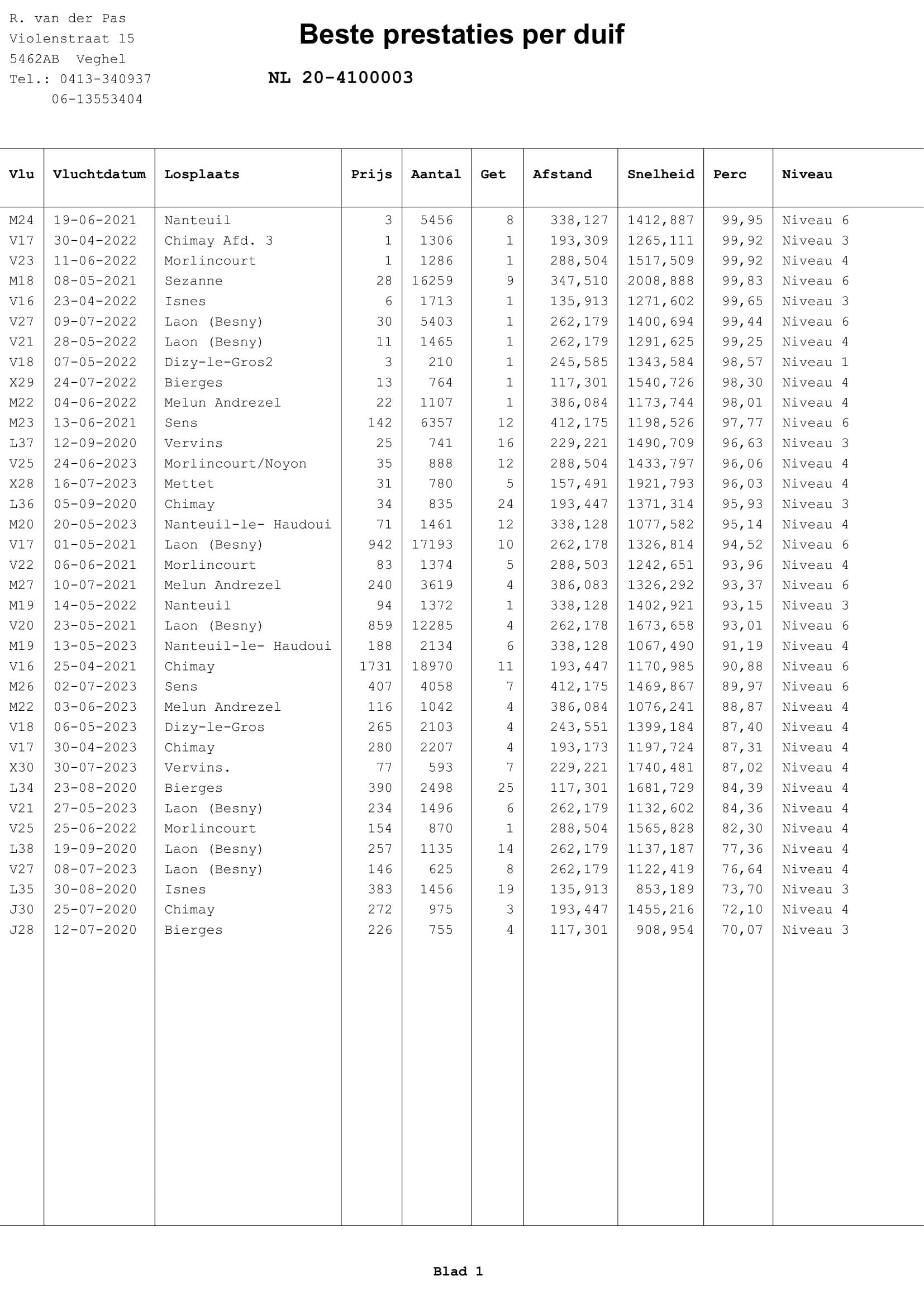 2022年“东布拉邦-第6大区”最佳短距离赛鸽冠军