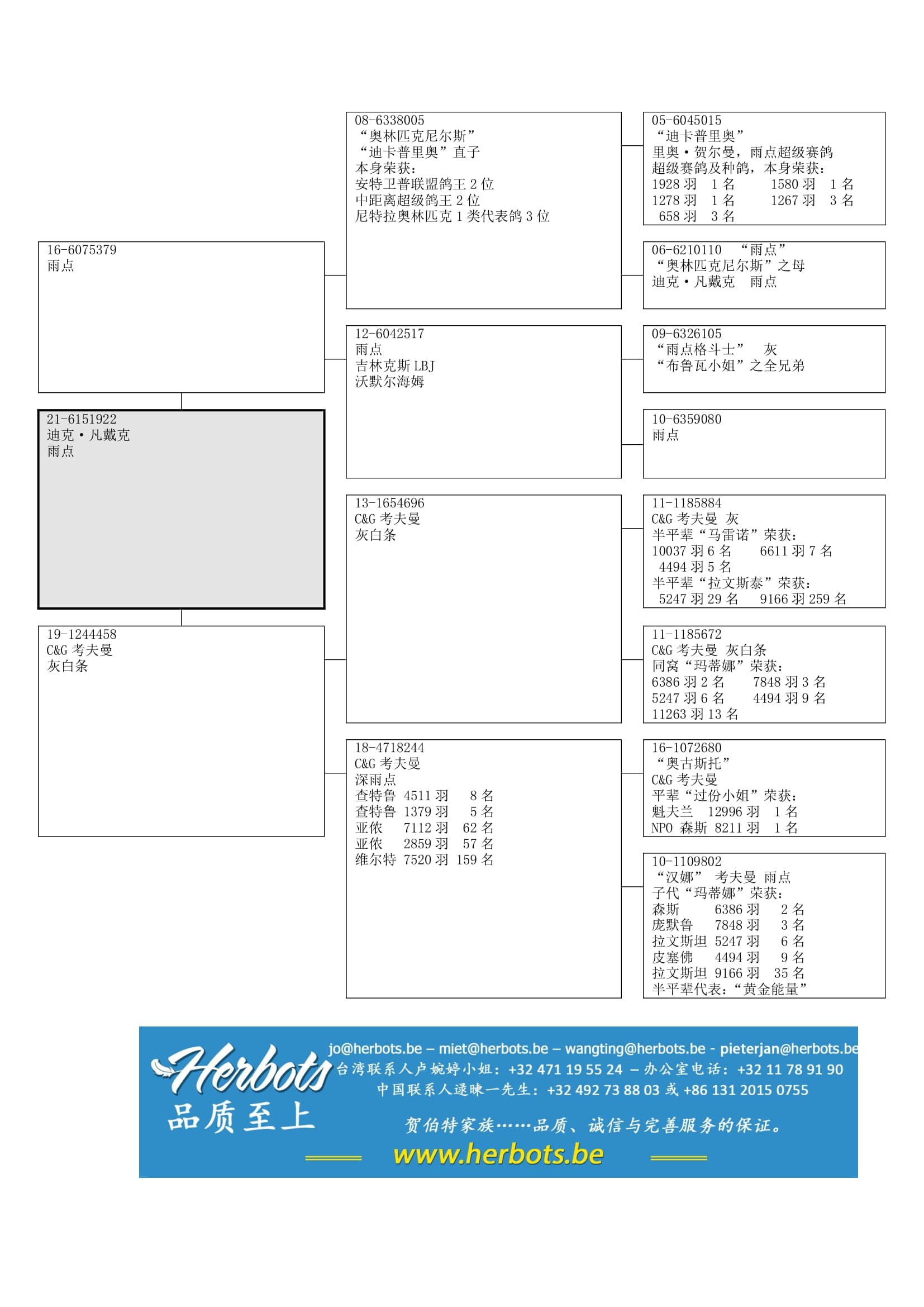 多羽冠军鸽之父/之祖父,比如:“友谊号”荣获:查特鲁国家赛1名--44221最快分速--瑞克·贺尔曼