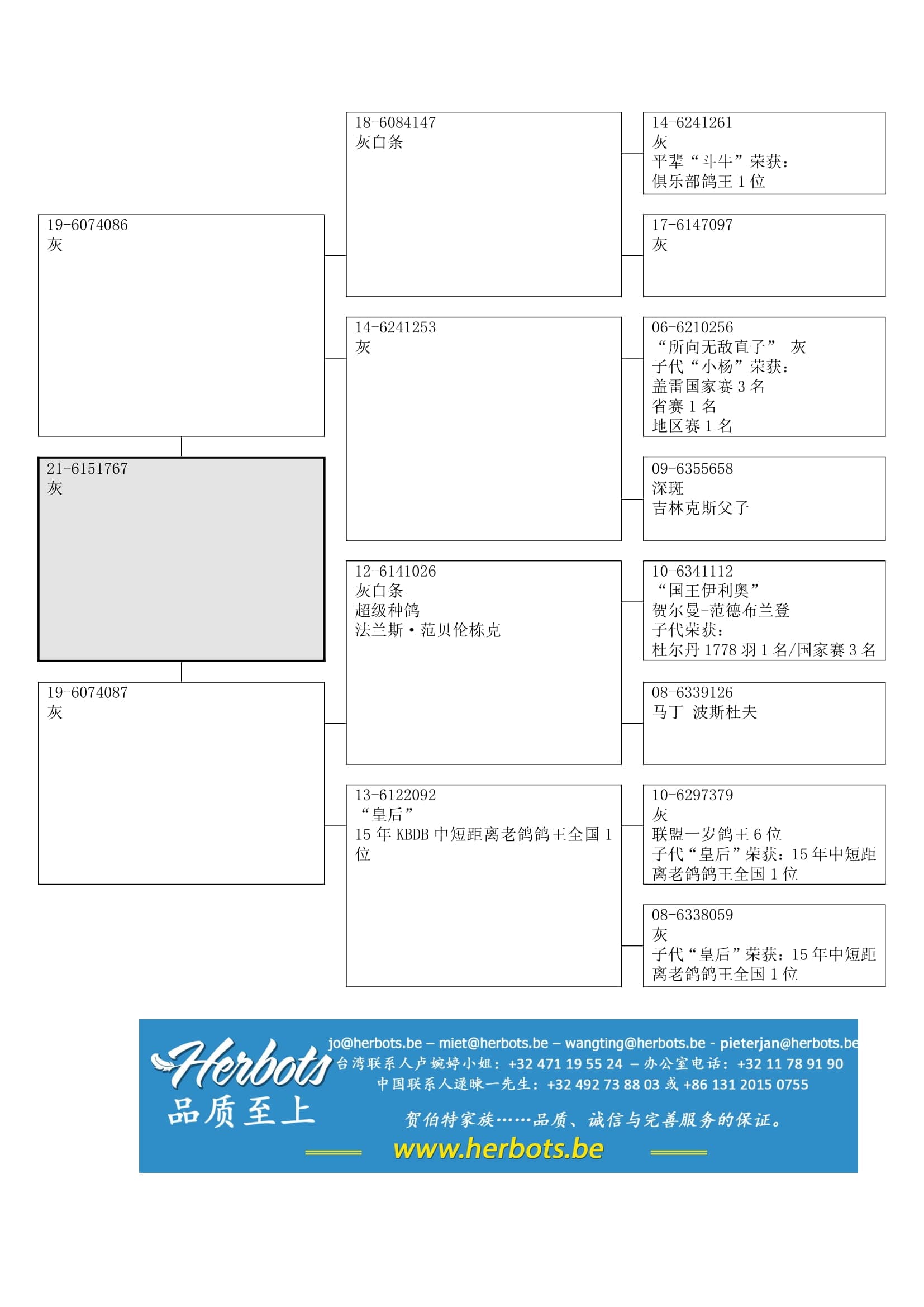 母亲: “皇后直女” B19-6074087 “B12-6141026” x “皇后”作育“B12-6141026” --范贝伦栋克原舍“皇后号” B13-6122092 荣获:KBDB中距离鸽王全国1位