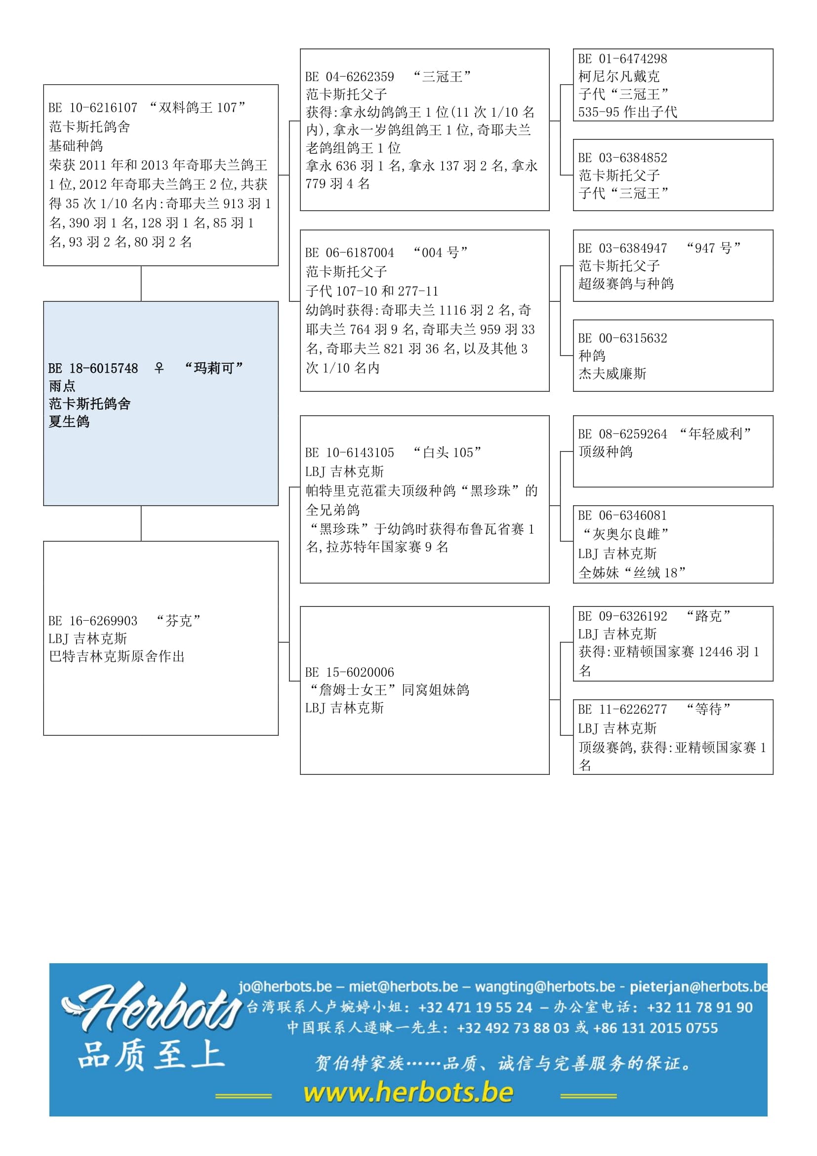 荣获: 2011 & 2013年奇耶夫兰俱乐部鸽王1位 - 2012年奇耶夫兰俱乐部鸽王2位 – 4次1名