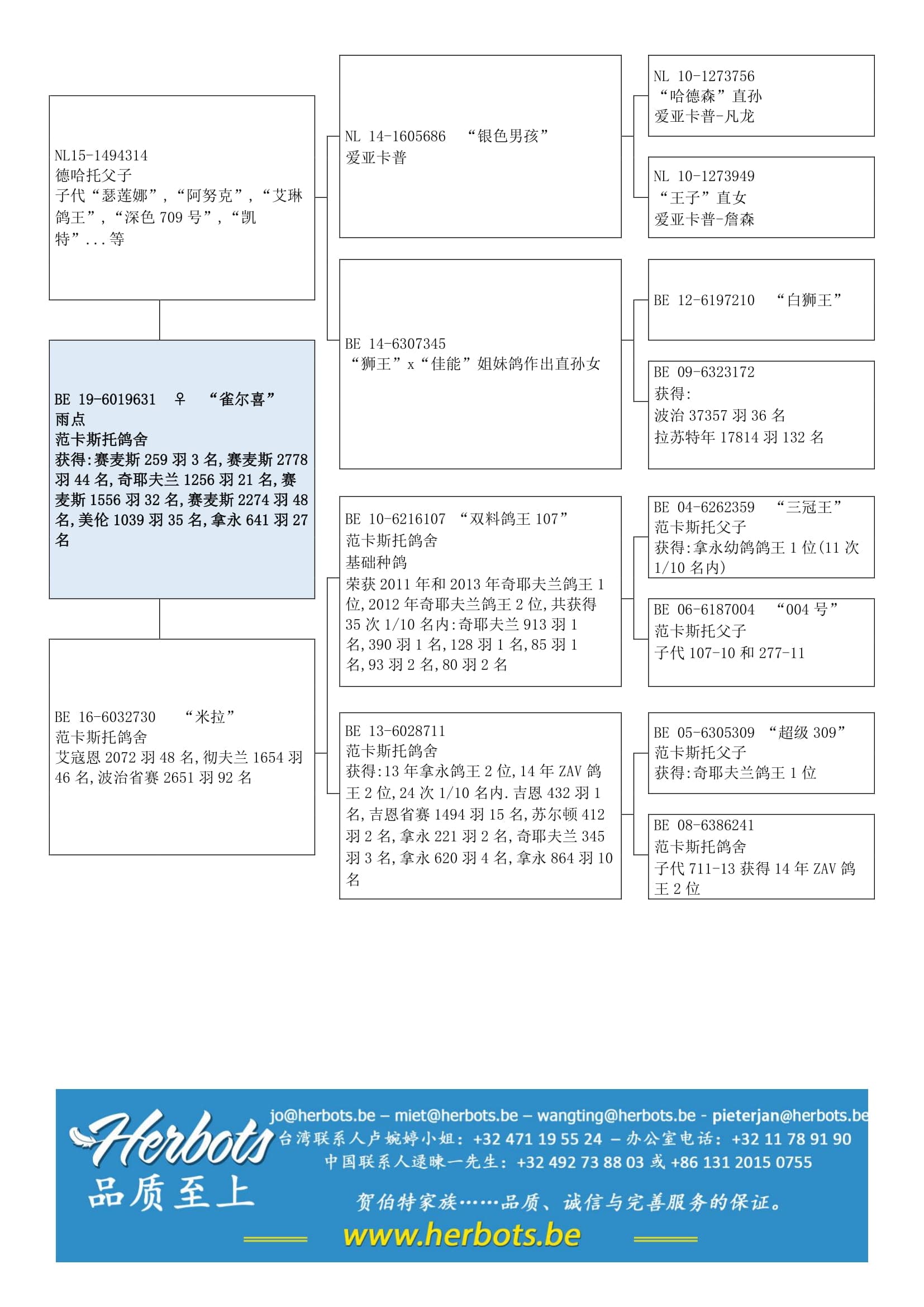 基础种鸽 “双料鸽王107”(2011 & 2013年奇耶夫兰俱乐部鸽王1位) x “B13-6028711” (13年拿永鸽2位–14年ZAV鸽王2位– 241/10名内) 作出直女