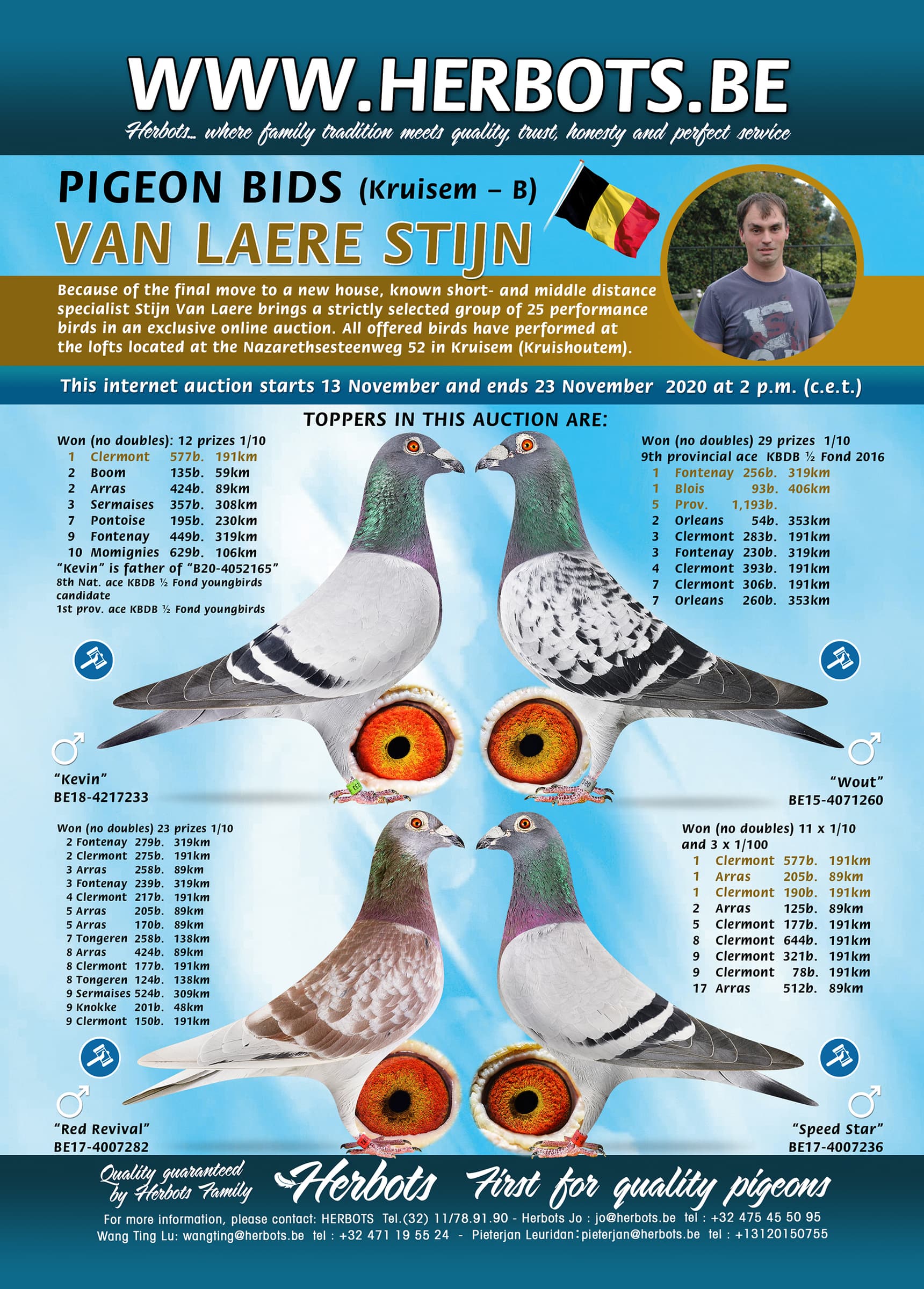 来自克鲁森镇的凡莱尔.斯汀(Van Laere Stijn)这个名字在世界范围内是比利时最好的中短距离鸽舍之一。 由于永久搬迁到新的住所,所有在严格挑选下幸存下来并在旧住址(Nazarthsesteenweg 52-Kruishoutem)上比赛的鸽子都将在此独家网络限时拍卖会中售出。