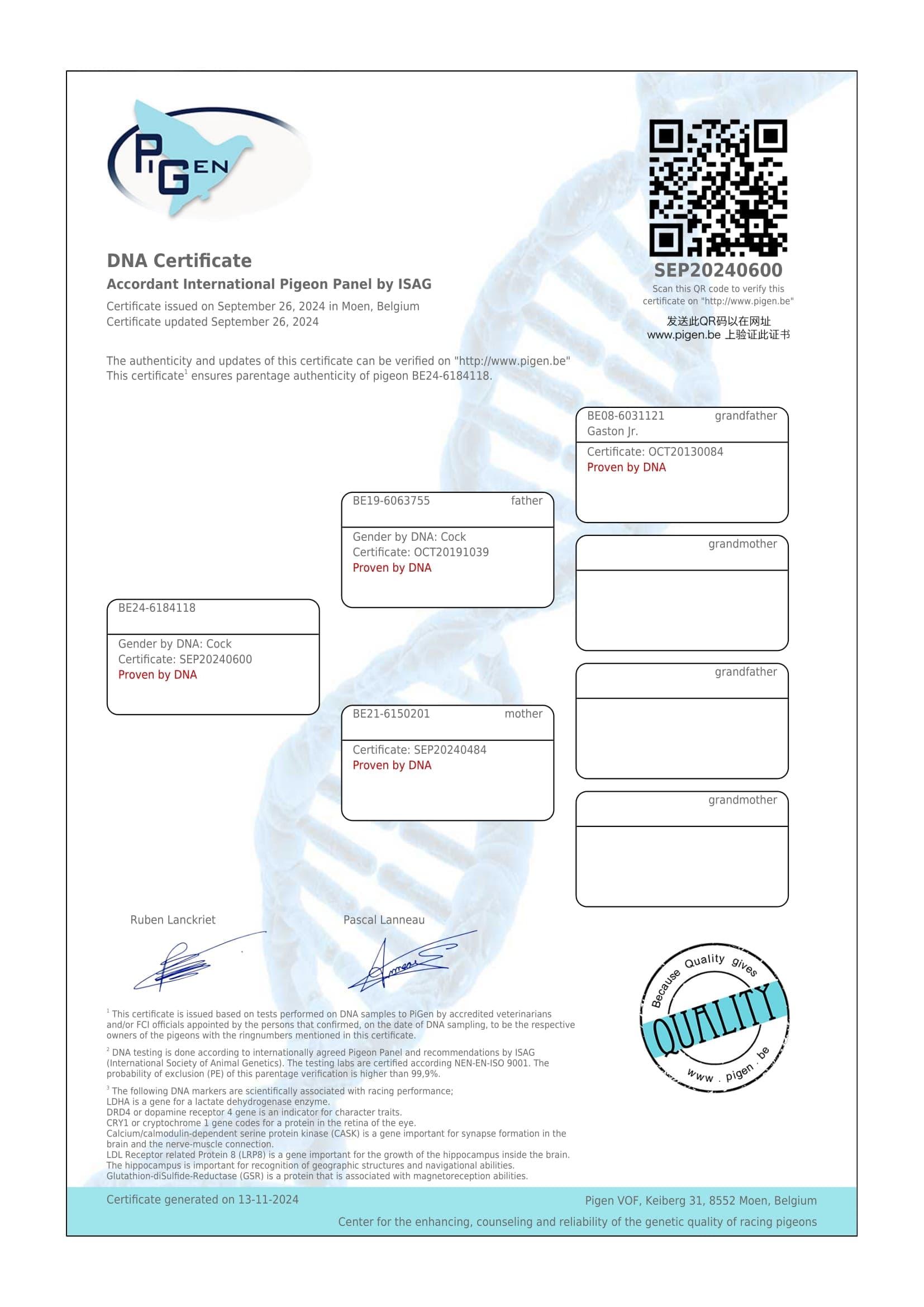 基础种鸽“葛思顿年轻号” (荣获:萨布里斯省赛1名 – 亚精顿省赛14名 – 查特鲁省赛17名和25名 - 子孙代获奖无数) x “古奇” (冠军种雌)直子