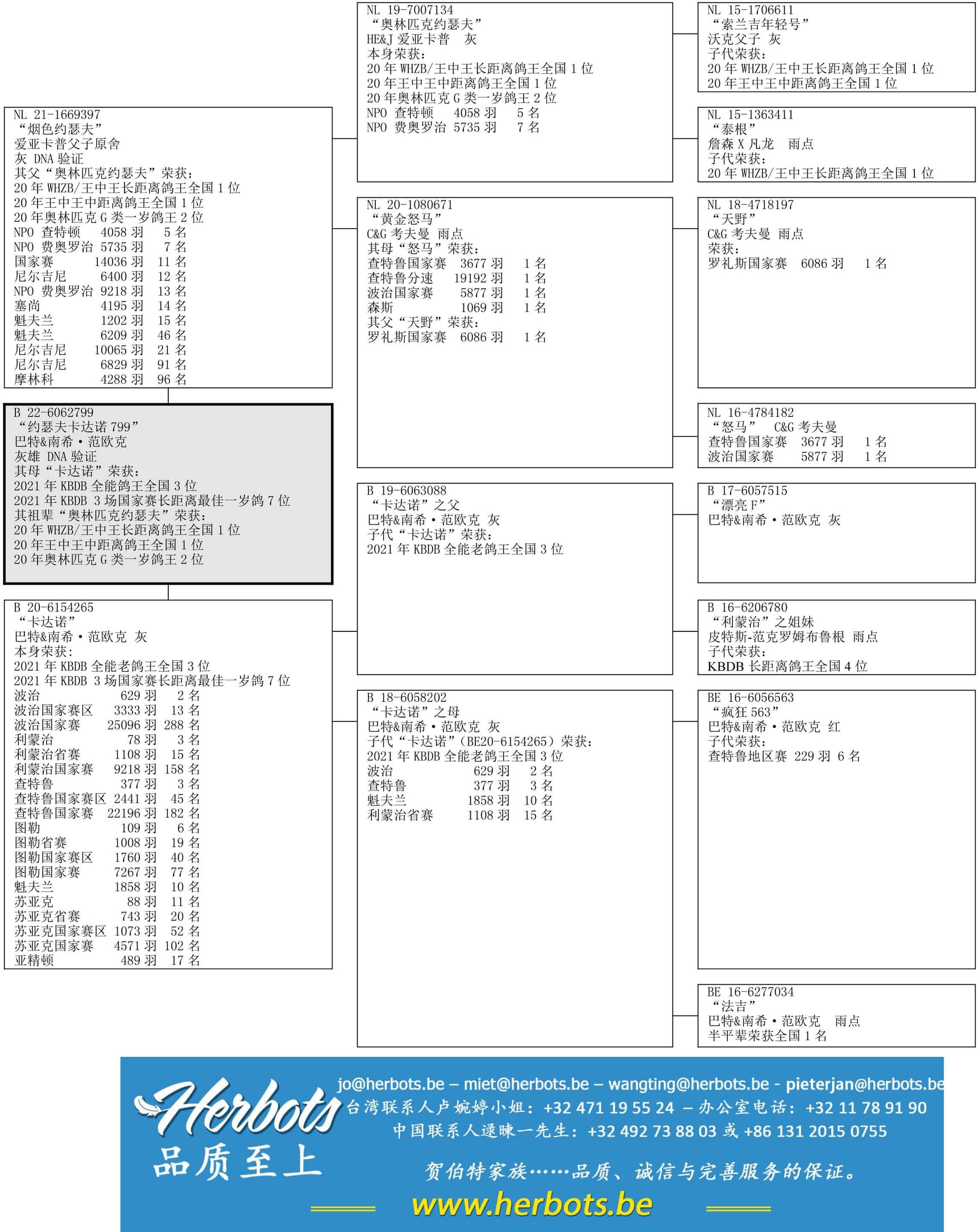 20年WHZB长距离鸽王全国1位 – 20年王中王中距离鸽王全国1位 – 20年奥林匹克 G类一岁鸽王 – NPO 查特顿 4,058羽5名 -NPO 费奥罗治 5,735羽7名 – 国家赛 14,036羽11名