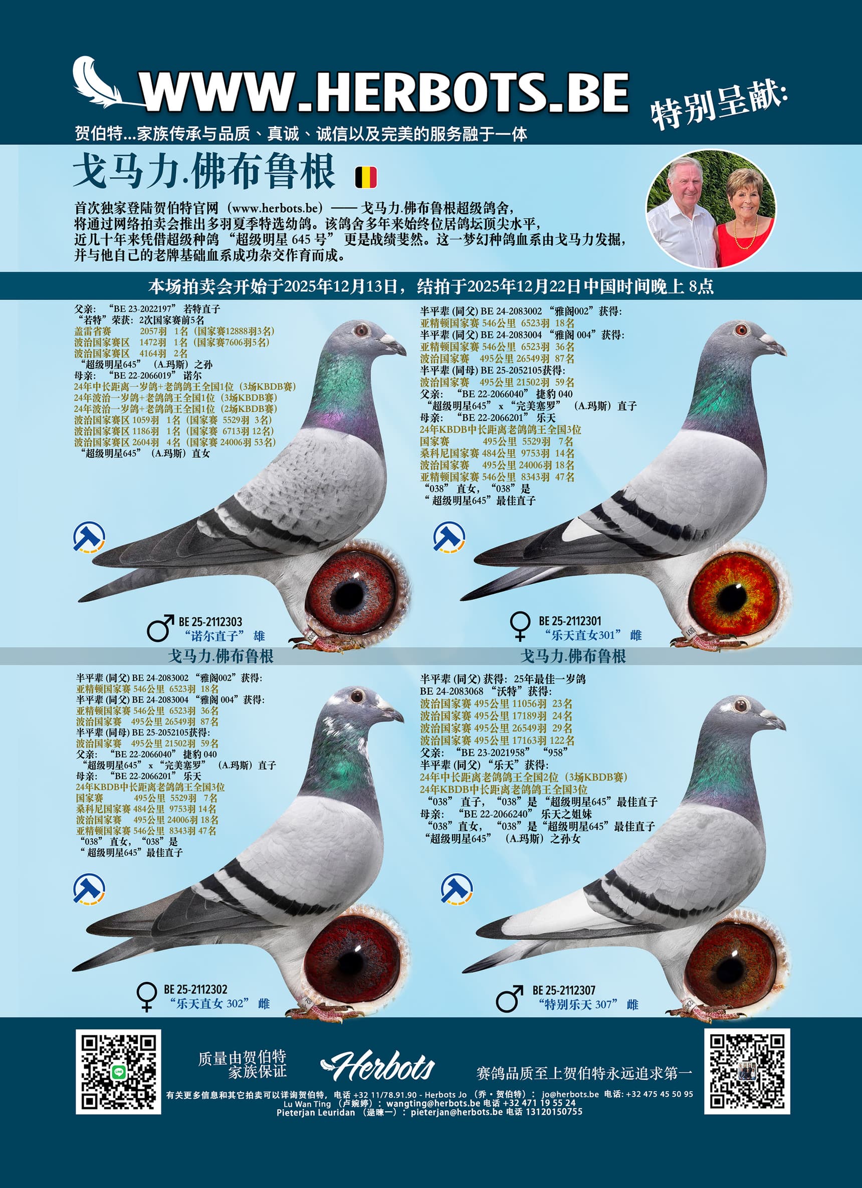 首次独家登陆贺伯特官网(www.herbots.be)—— 戈马力.佛布鲁根超级鸽舍,将通过网络拍卖会推出多羽夏季特选幼鸽。该鸽舍多年来始终位居鸽坛顶尖水平,近几十年来凭借超级种鸽 “超级明星 645 号” 更是战绩斐然。这一梦幻种鸽血系由戈马力发掘,并与他自己的老牌基础血系成功杂交作育而成。