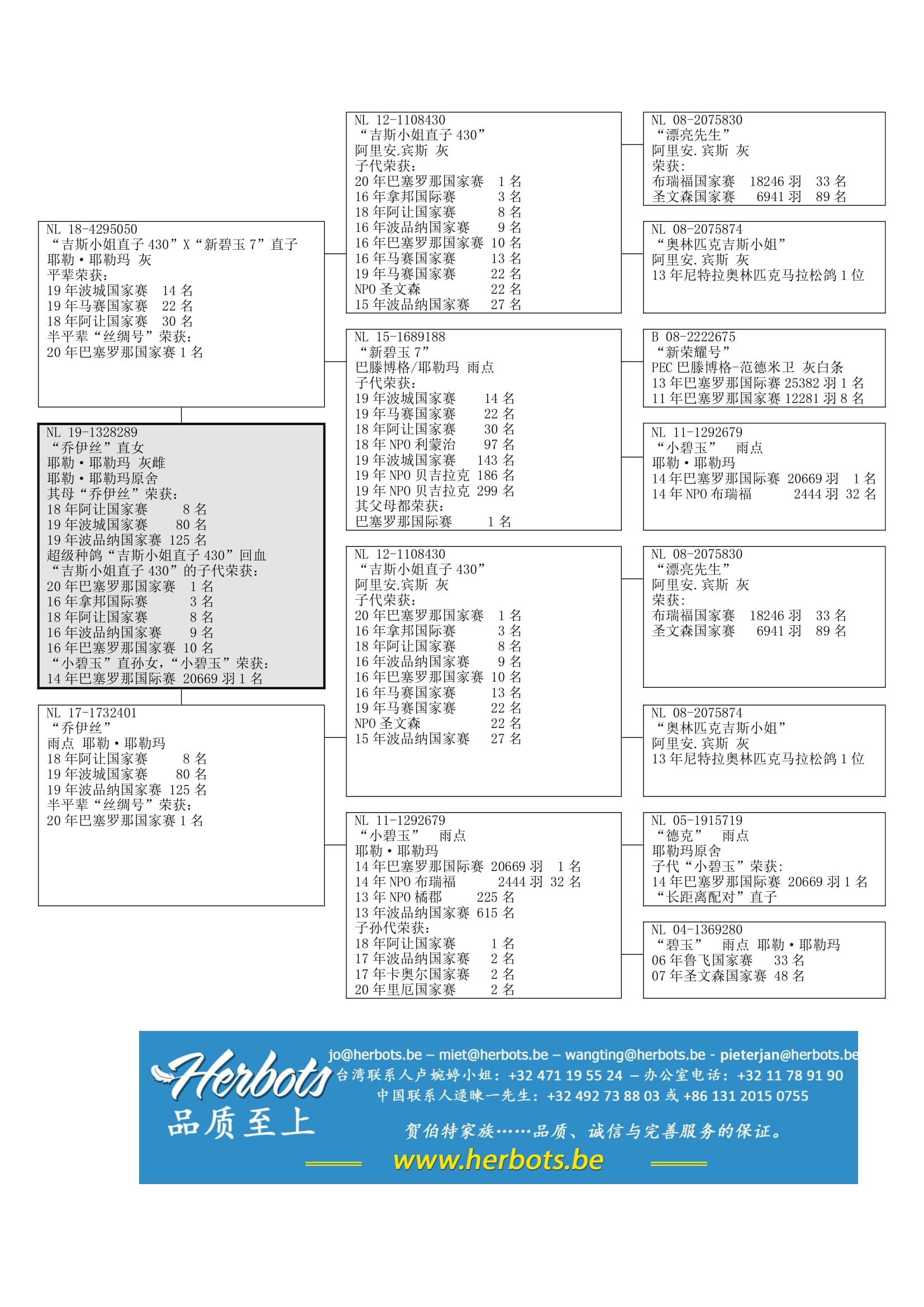 “吉斯小姐直子430” (NL12-1108430) x “小碧玉” (巴塞罗那国际赛 20,669羽1名) 作出