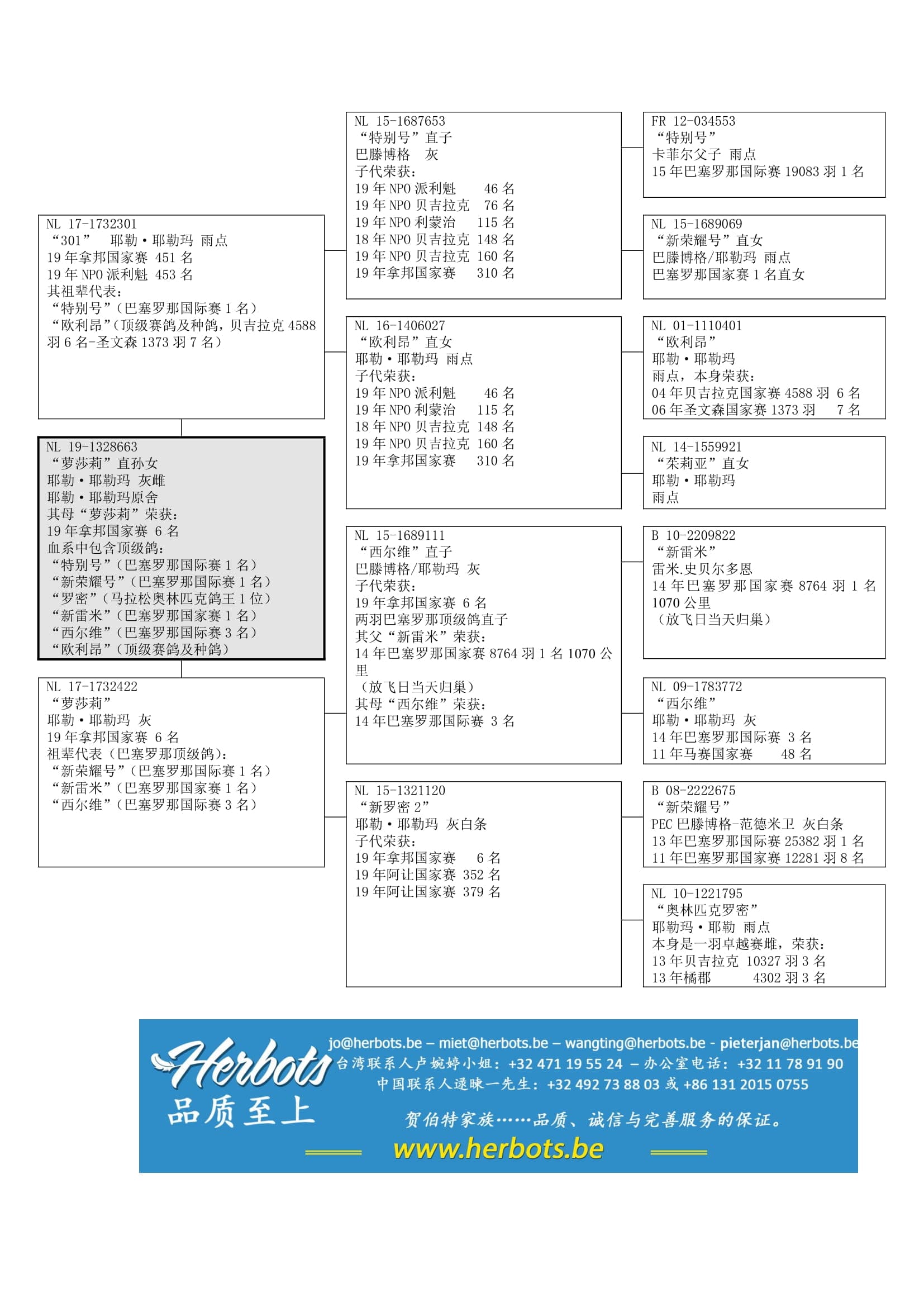 “新荣耀号” (巴塞罗那国际赛 25,381羽1名) x “罗密” ( 荣获: 布达佩斯奥林匹克马拉松代表鸽 - 贝吉拉克国家赛 10,327羽3名 - 橘郡国家赛 4,302羽3名 - NPO 圣文森 1,365羽3名 - 布瑞福国家赛 7,241羽5名 - NPO 欧瑞拉克 3,072羽6名)直女