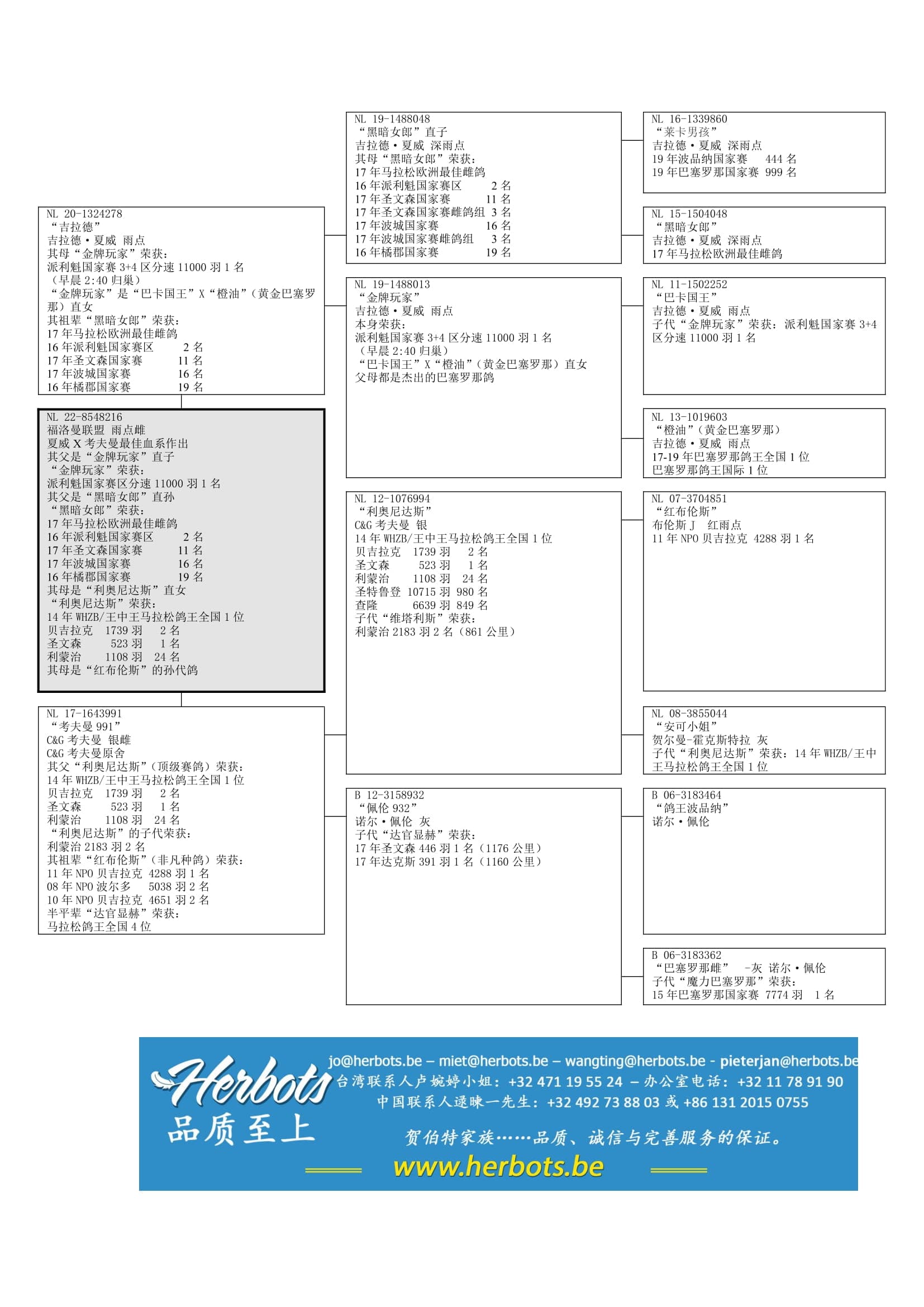“莱卡男孩”(半平辈“黑暗女郎”荣获:派利魁国家赛3名, 阿让国家赛33名) x “黑暗女郎”(2017年马拉松欧洲最佳雌鸽)作出