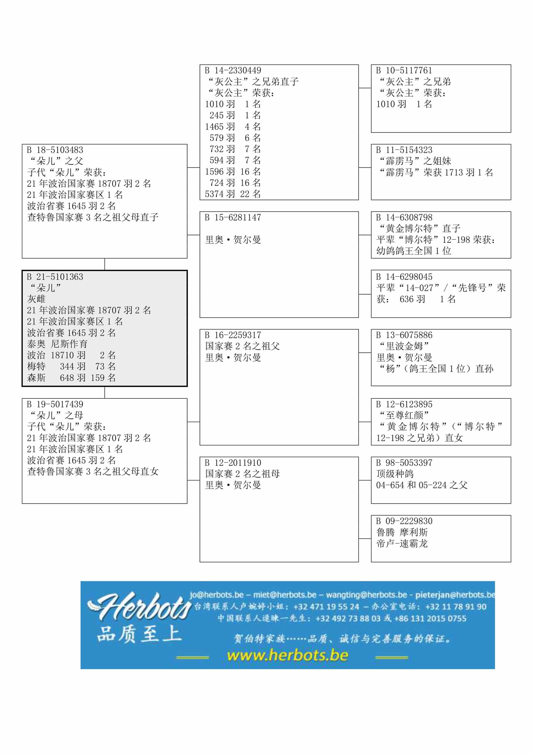 “灰公主之兄弟直子” (“灰公主” 荣获: 1,010羽1名 – 245羽1名 – 1,465羽4名– 579羽6名 – 732羽7名 – 594羽7名 – 1,596羽16名 – 5,374羽22名) x “B15-6281147” (里奥·贺尔曼原舍 – “黄金博尔特直子”x “先锋号之姐妹”直子;“黄金博尔特”是铭鸽“博尔特”之兄弟- ) 直子