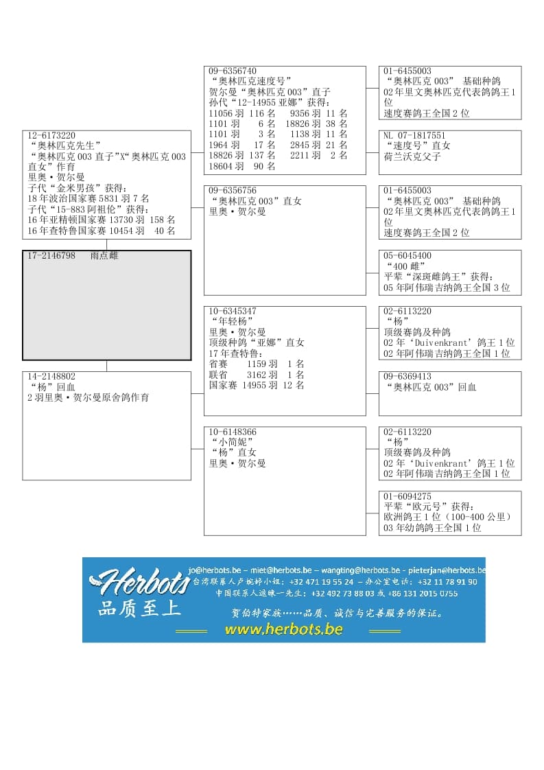 顶级种鸽“奥林匹克先生”直女100%里奥·贺尔曼(“奥林匹克003”/“杨”)半平辈“基米男孩”获得:波治国家赛 466公里 5831羽 7名半平辈“阿祖伦”获得:查特鲁国家赛 517公里 10454羽 40名亚精顿国家赛 546公里 13730羽 158名