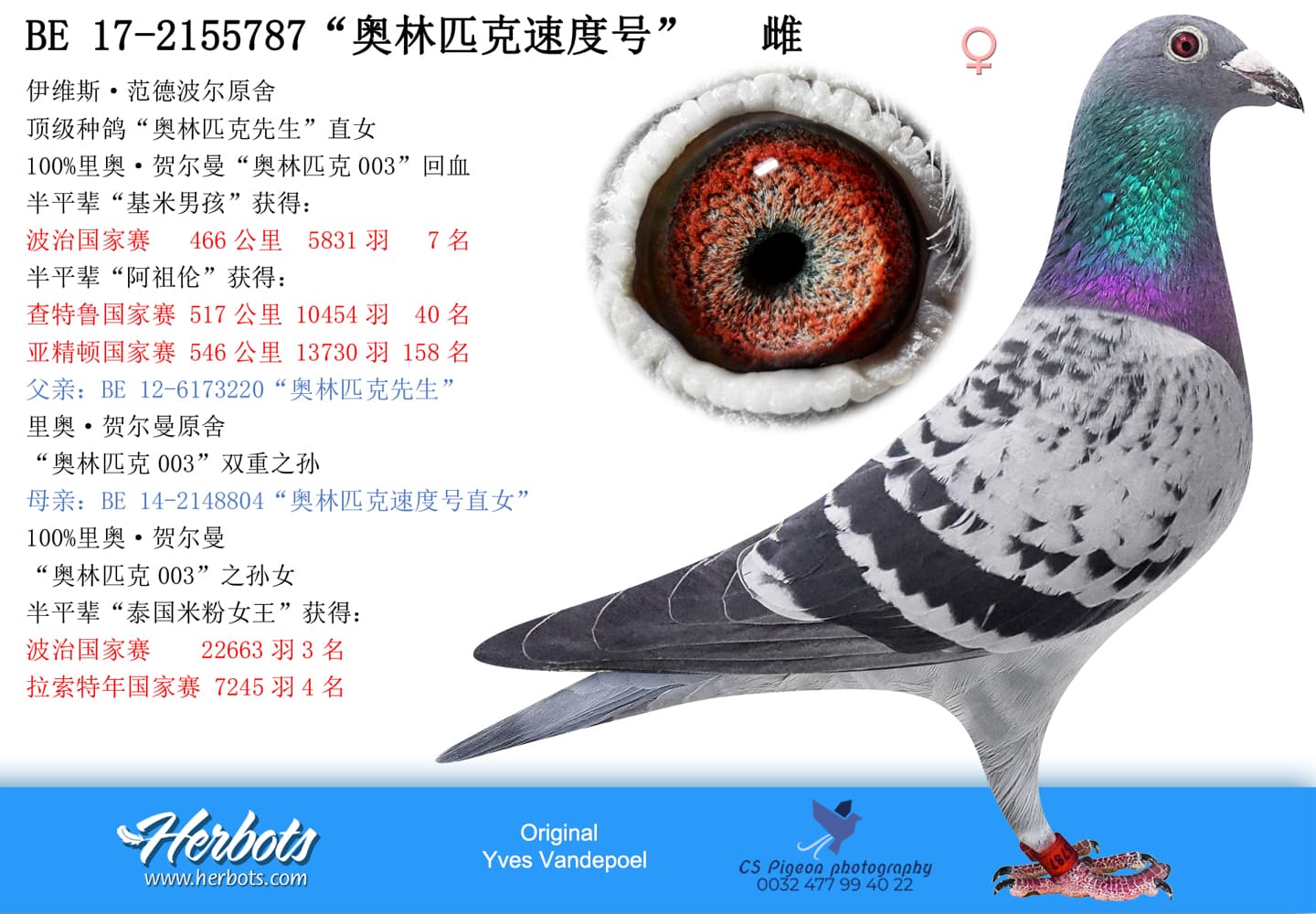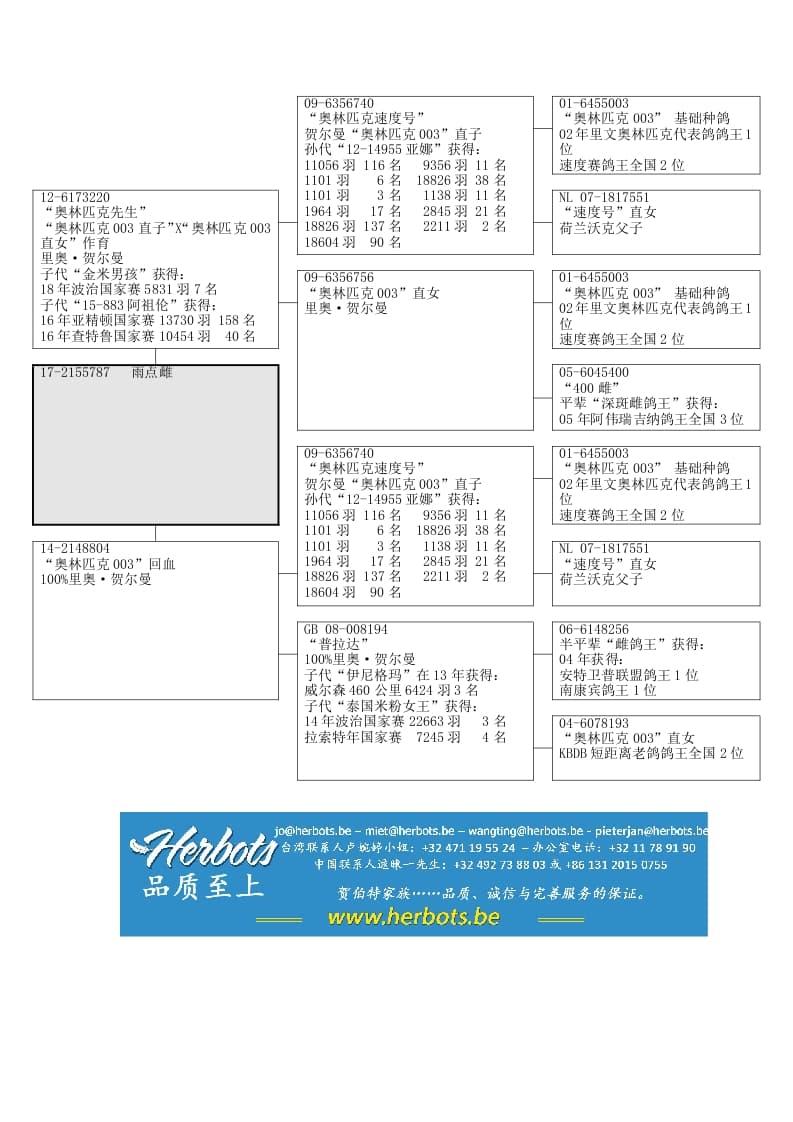 顶级种鸽“奥林匹克先生”直女100%里奥·贺尔曼“奥林匹克003”回血半平辈“基米男孩”获得:波治国家赛 466公里 5831羽 7名半平辈“阿祖伦”获得:查特鲁国家赛 517公里 10454羽 40名亚精顿国家赛 546公里 13730羽 158名
