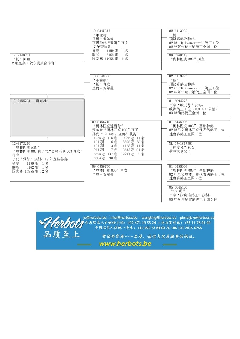 (最佳鸽系:“杨”/“奥林匹克003”)100%里奥·贺尔曼半平辈“雅娜”(同母)获得:查特鲁半国家赛517公里3162羽1名国家赛14955羽12名