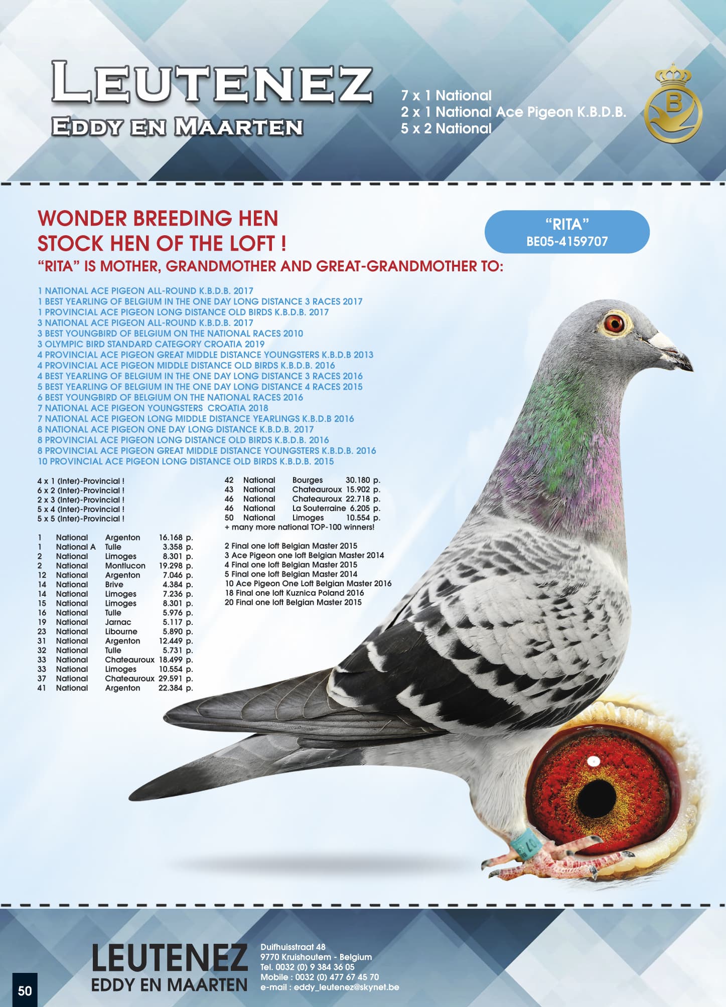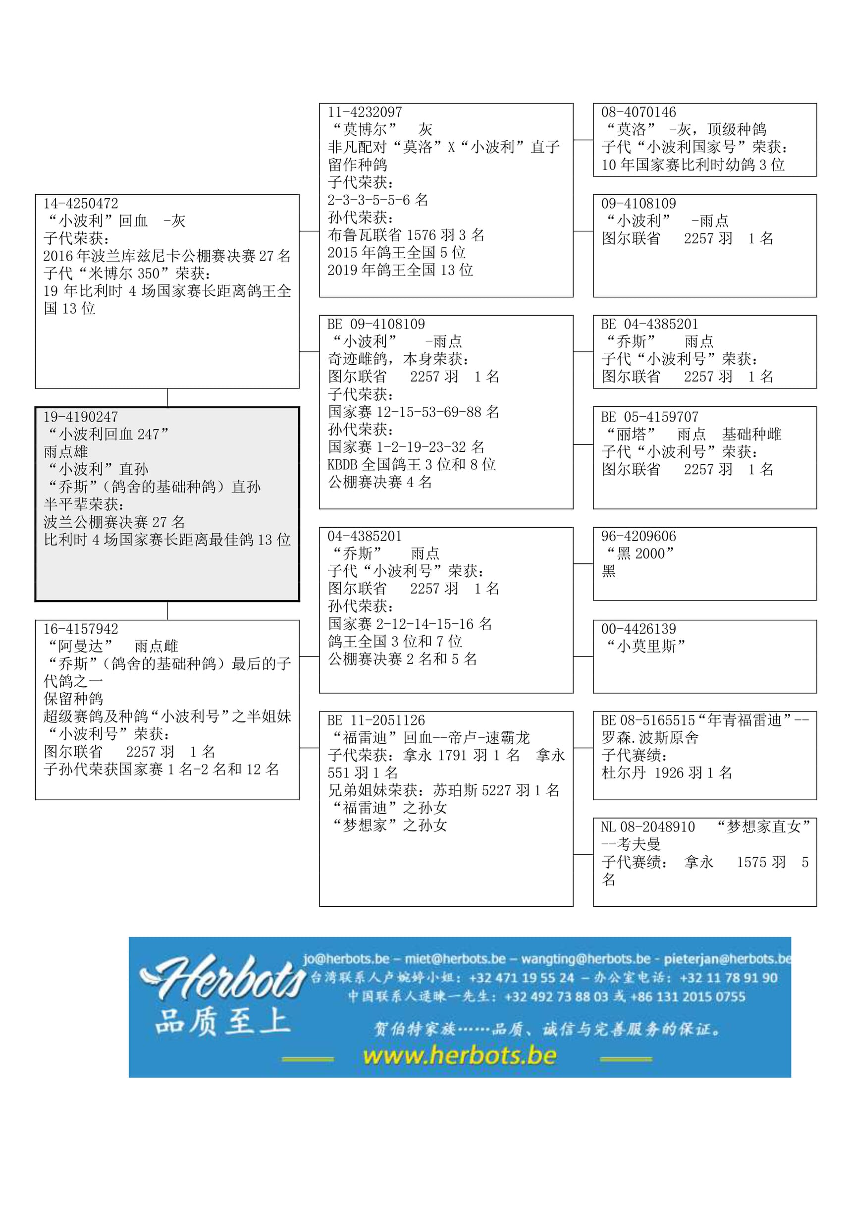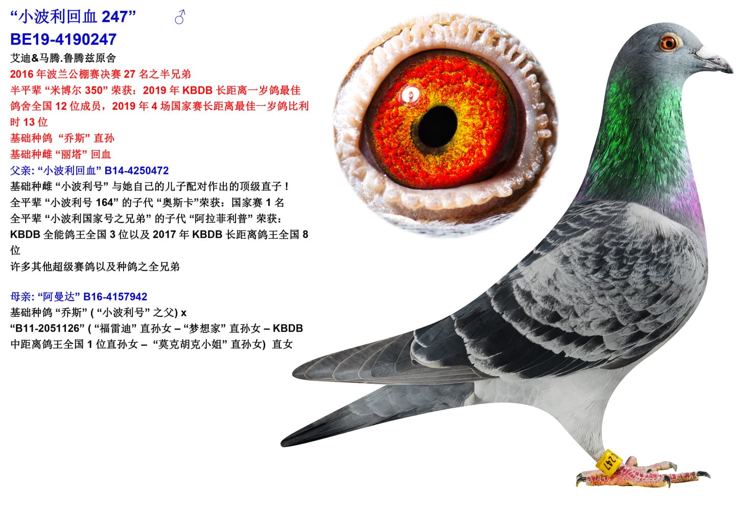 2016年波兰公棚赛决赛27名之半兄弟 半平辈 “米博尔 350” 荣获:2019年KBDB长距离一岁鸽最佳鸽舍全国12位成员,2019年4场国家赛长 最佳一岁鸽比利时13位基础种鸽 “乔斯” 直孙基础种雌 “丽塔” 回血