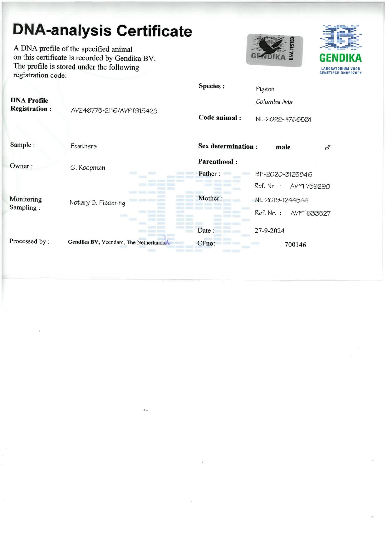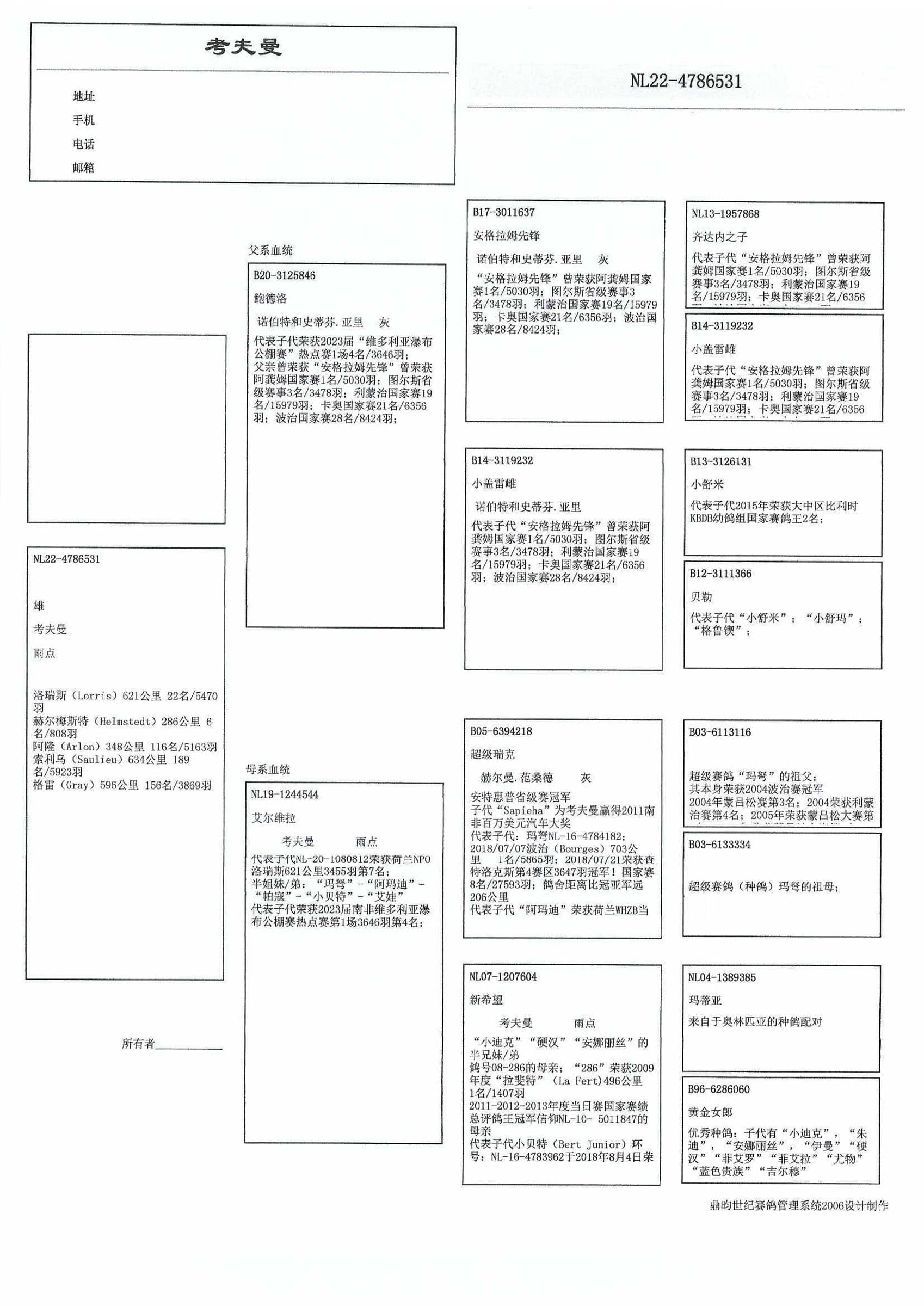 “安格拉姆先锋” (1名全国 安格拉姆 5,030 成鸽组– 最快 9,555羽 - 3名省级 图尔斯 3,478羽 – 71名省级 蓬图瓦兹18,184羽 - 90名 全国 利蒙治 7,236羽 ) x “小盖雷雌”