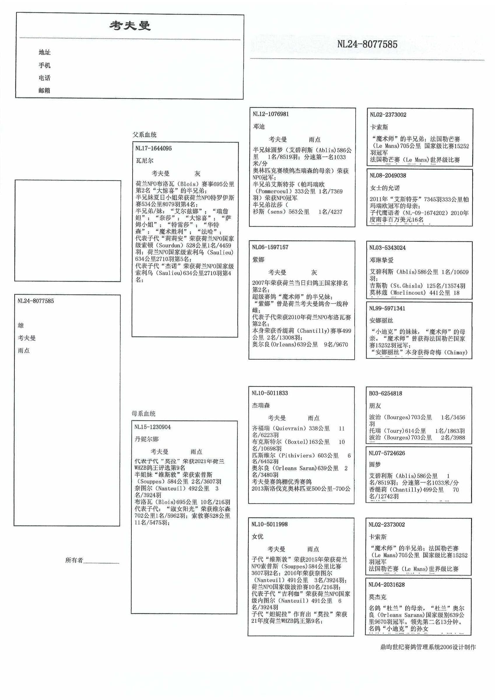 “邓迪” (“杀手锏”兄弟) x “紫娜” (2名全国鸽王 当日归长距离 ’07)