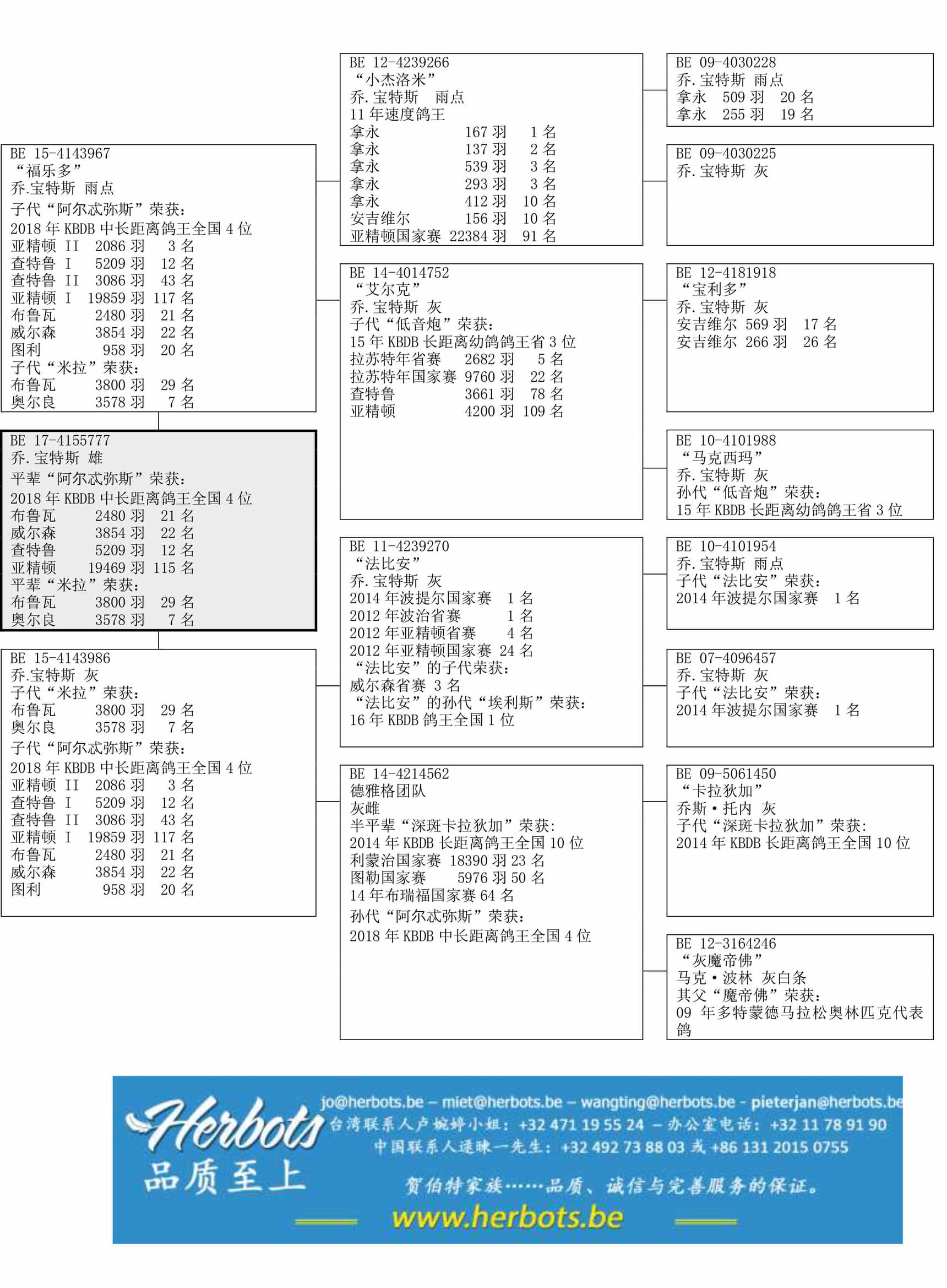 全平辈“阿尔忒弥斯”荣获:2018年KBDB中长距离鸽王全国4位全平辈“米拉”荣获:奥尔良 3,578羽7名 – 布鲁瓦3,800羽29名其祖辈“法比安”荣获:波提尔国家赛 12,379羽1名 – 波治省赛 2,473羽1名