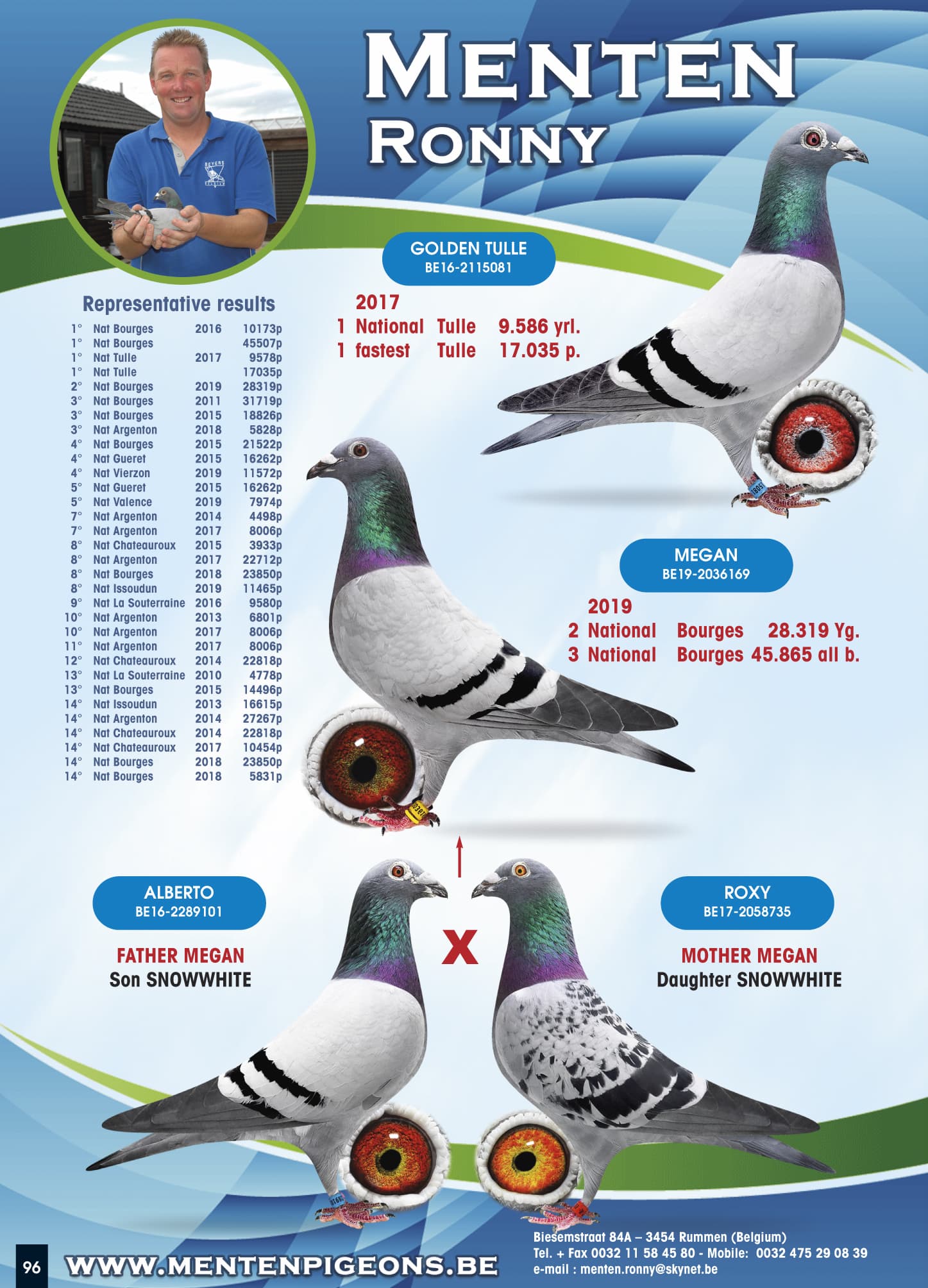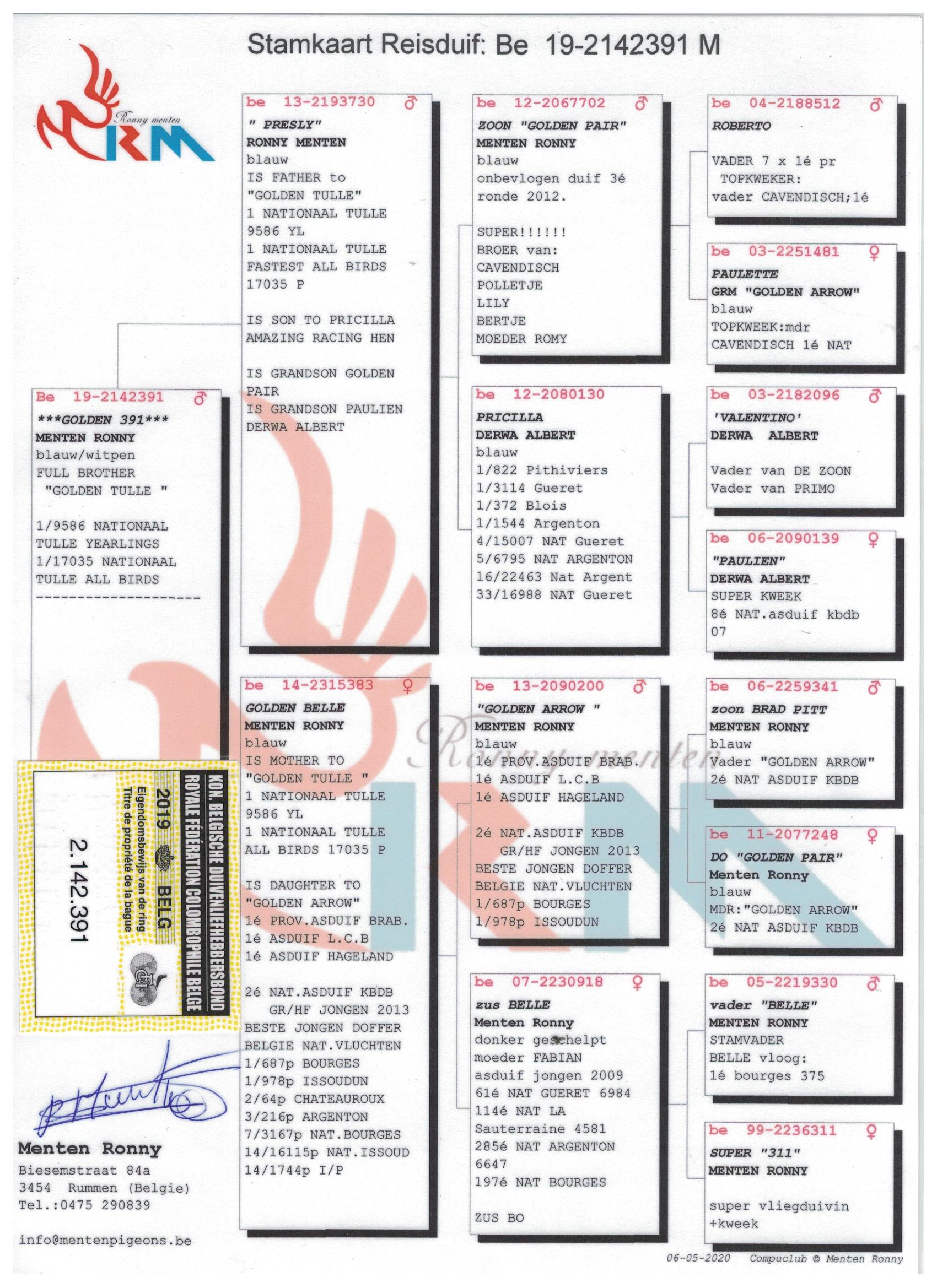 其祖辈 “金箭” 荣获: KBDB 弗拉姆-布拉邦鸽王省1位 - 2013年KBDB中长距离幼鸽鸽王全国2位 - 2013年比利时国家赛最佳幼鸽