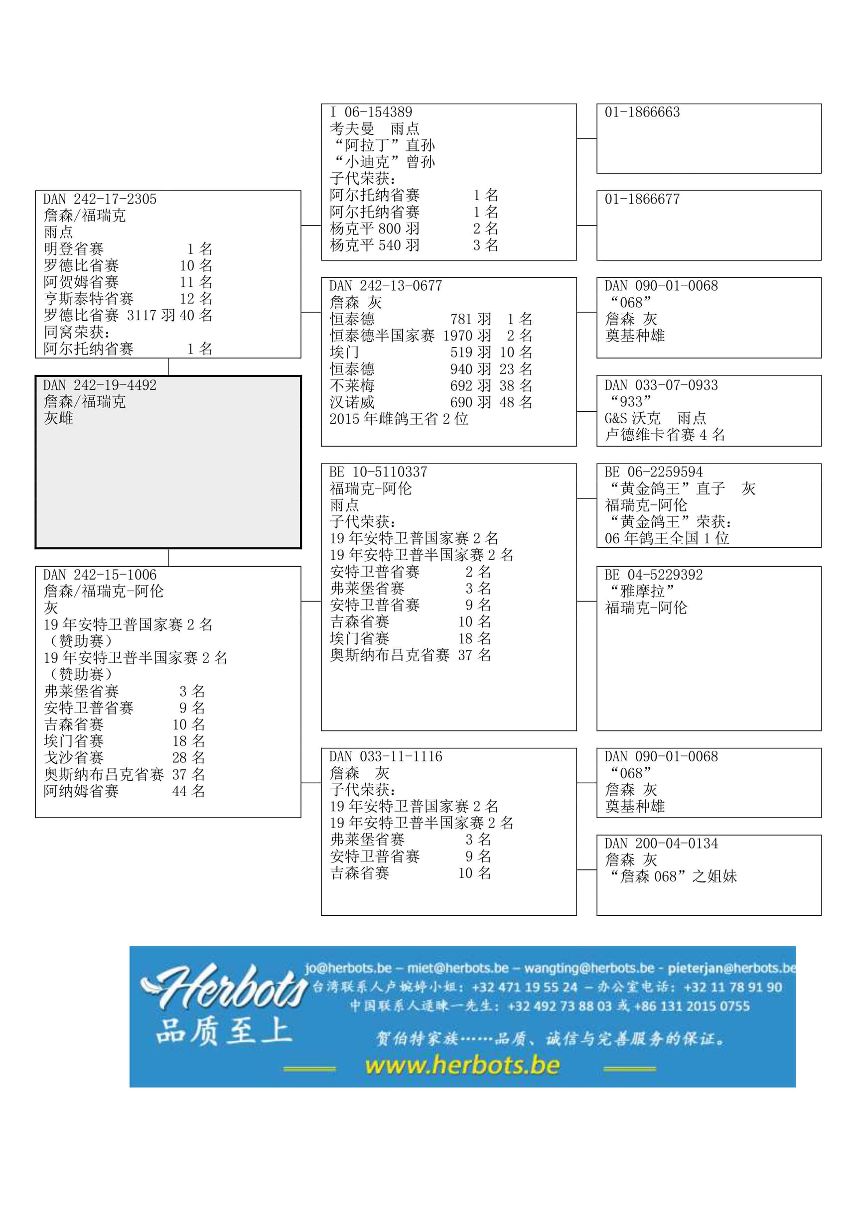 其父 “2305” 荣获:明登省赛1名, 罗德比省赛10名, 阿贺姆省赛11名, 亨斯泰特省赛12名,罗德比省赛 3,117羽40名 . 鸽系: 考夫曼 x 詹森其母 “1006”荣获:19年安特卫普国家赛2名 – 弗莱堡省赛3名 – 安特卫普省赛9名 – 吉森省赛10名