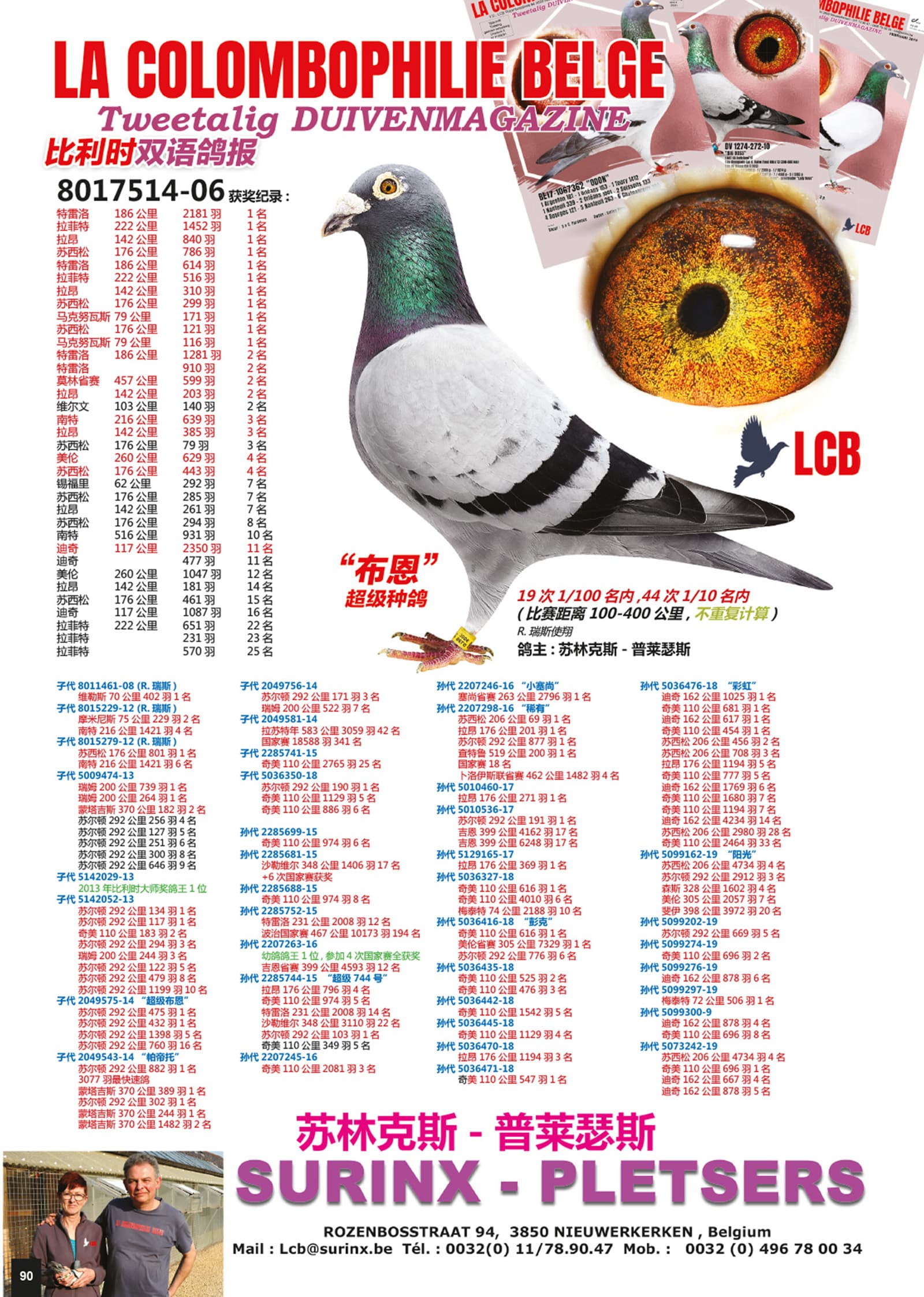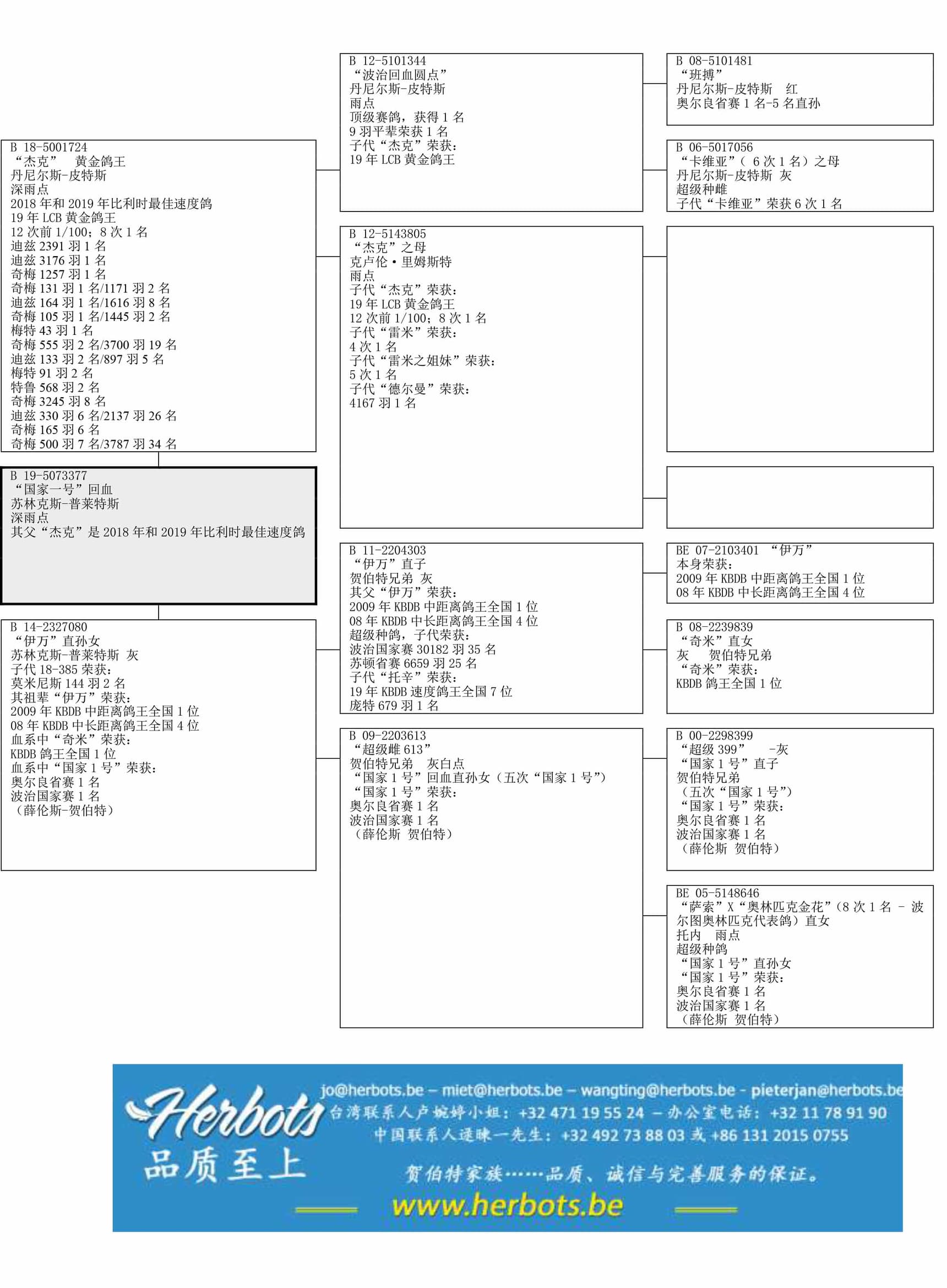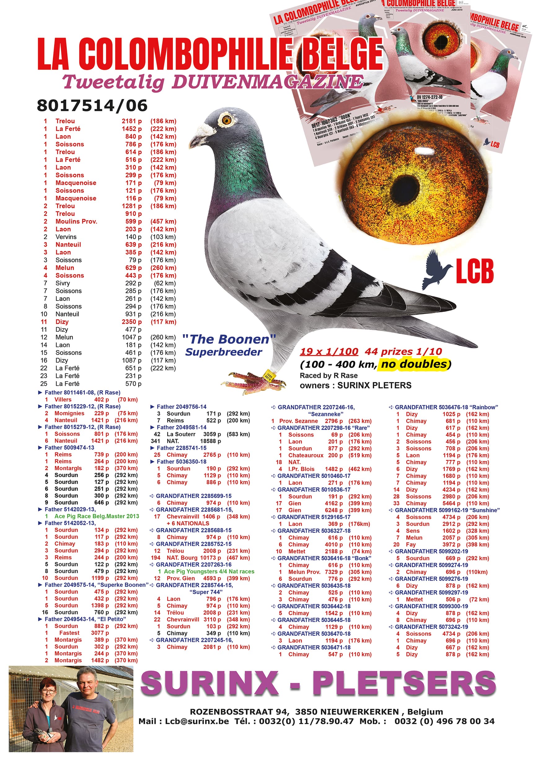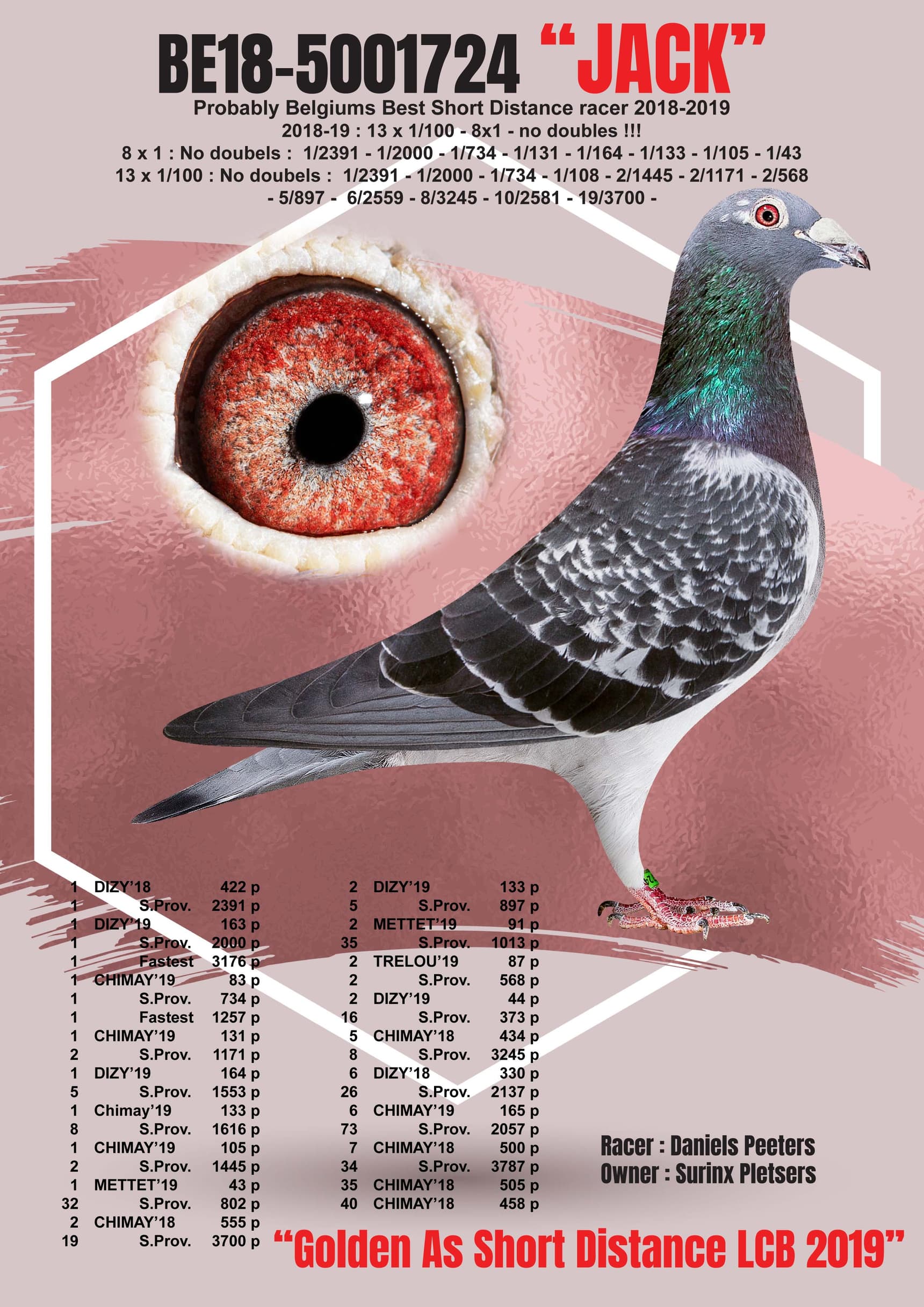 其父“杰克”荣获:18年- 19年比利时短距离最佳鸽 – 荣获: 12 次前1/100 – 8 次1名