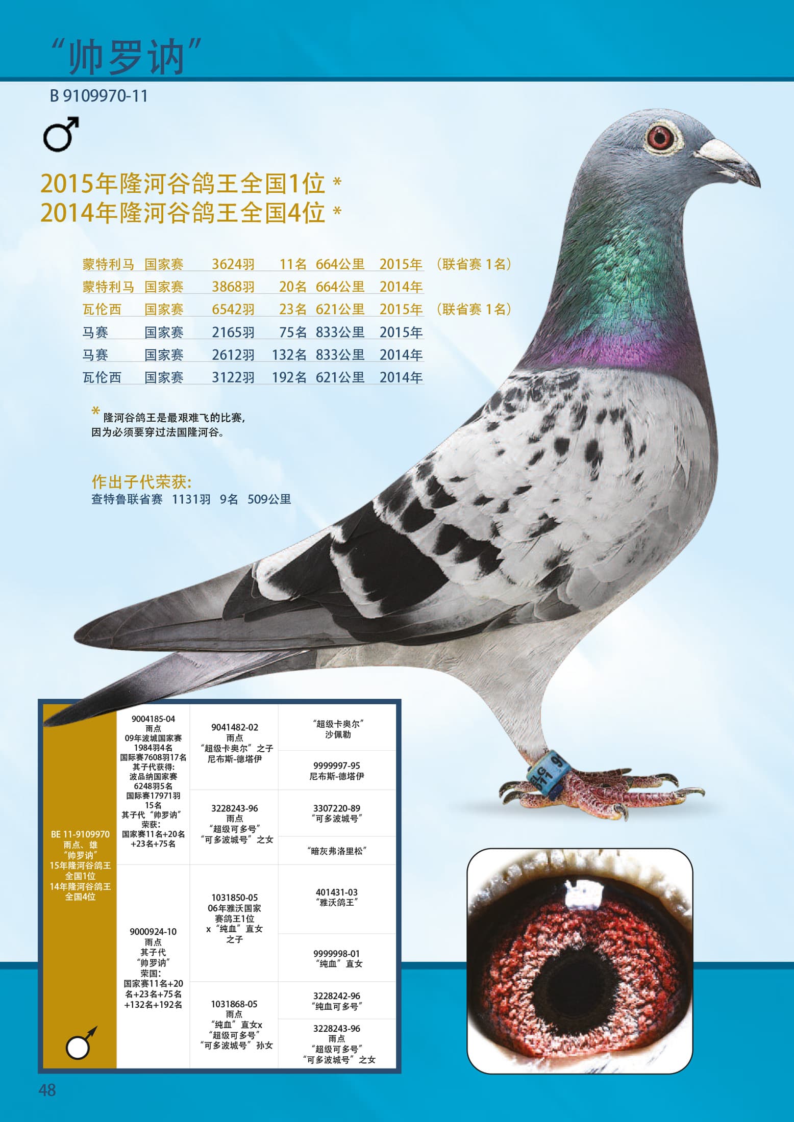 其父 “漂亮罗讷”荣获:15年罗讷谷鸽王全国1位 - 14年罗讷谷鸽王全国4位 – 国家赛11名,20名, 23名和 75名