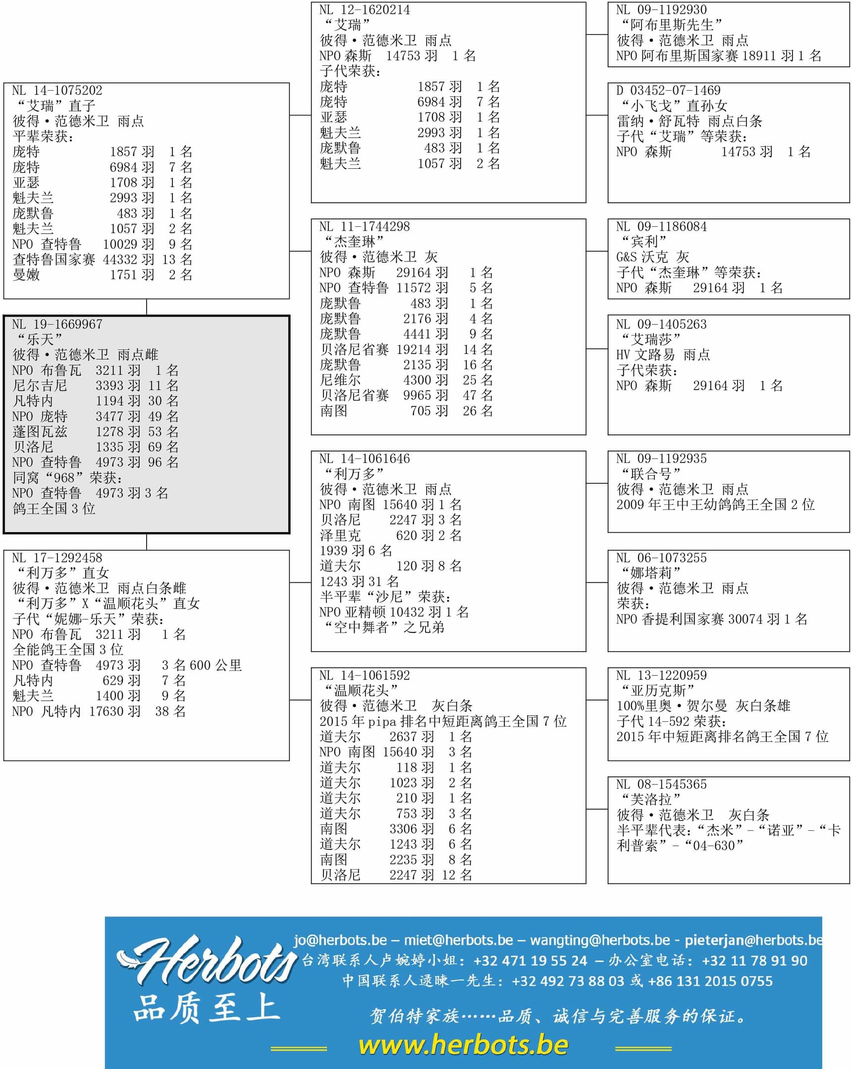 “利万多”( NPO 南图 15,640羽1名 – 贝洛尼 2,247羽3名) x “温顺花头雌” (2015年鸽王全国7位) 直女