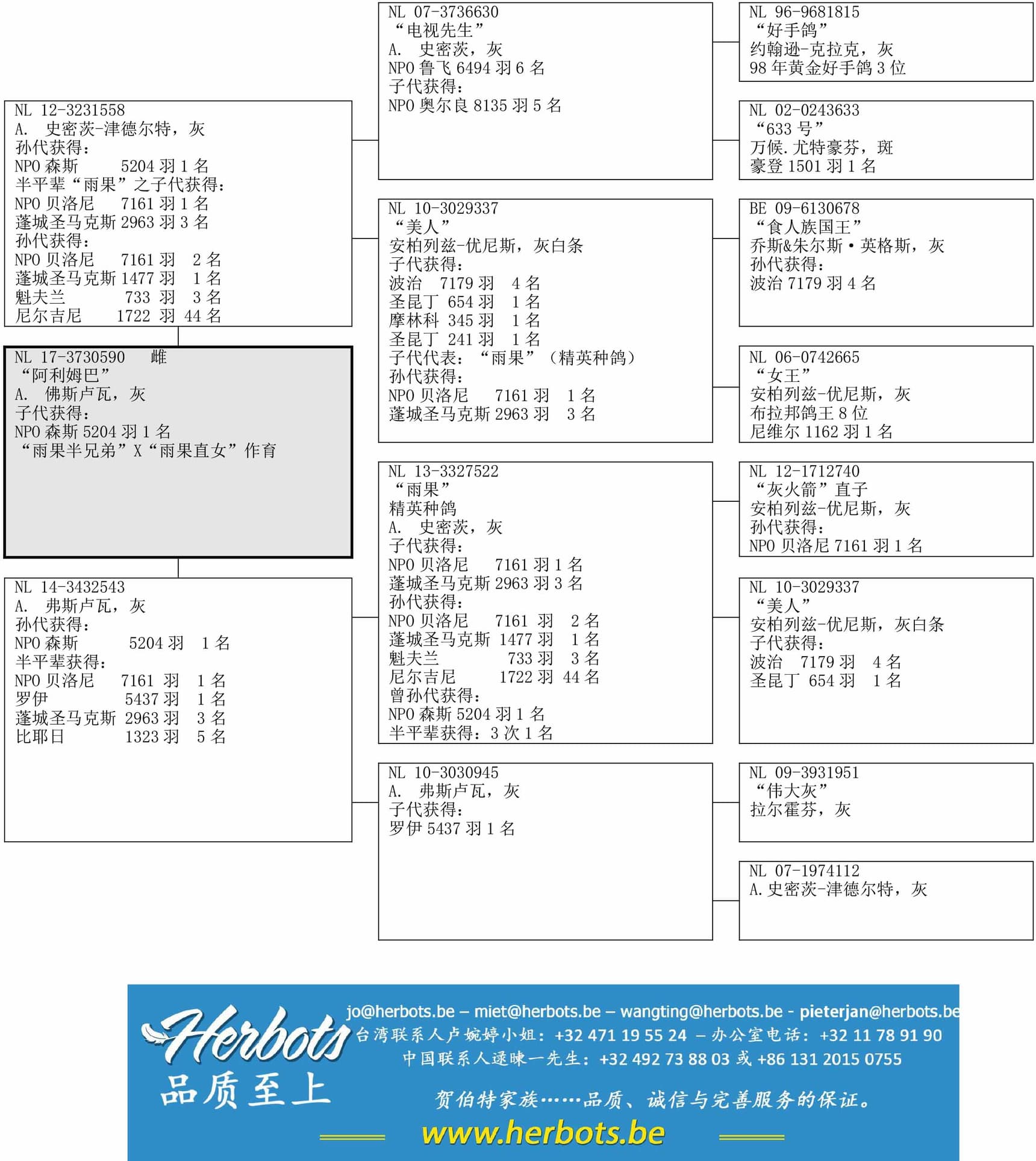 母亲: “NL14-3432543” “雨果” x “NL10-3030945”作育直女半平辈获得:贝洛尼省赛 7161羽 1名罗伊 5437羽 1名蓬城圣马克斯 2963羽 3名比耶日 1323羽 5名