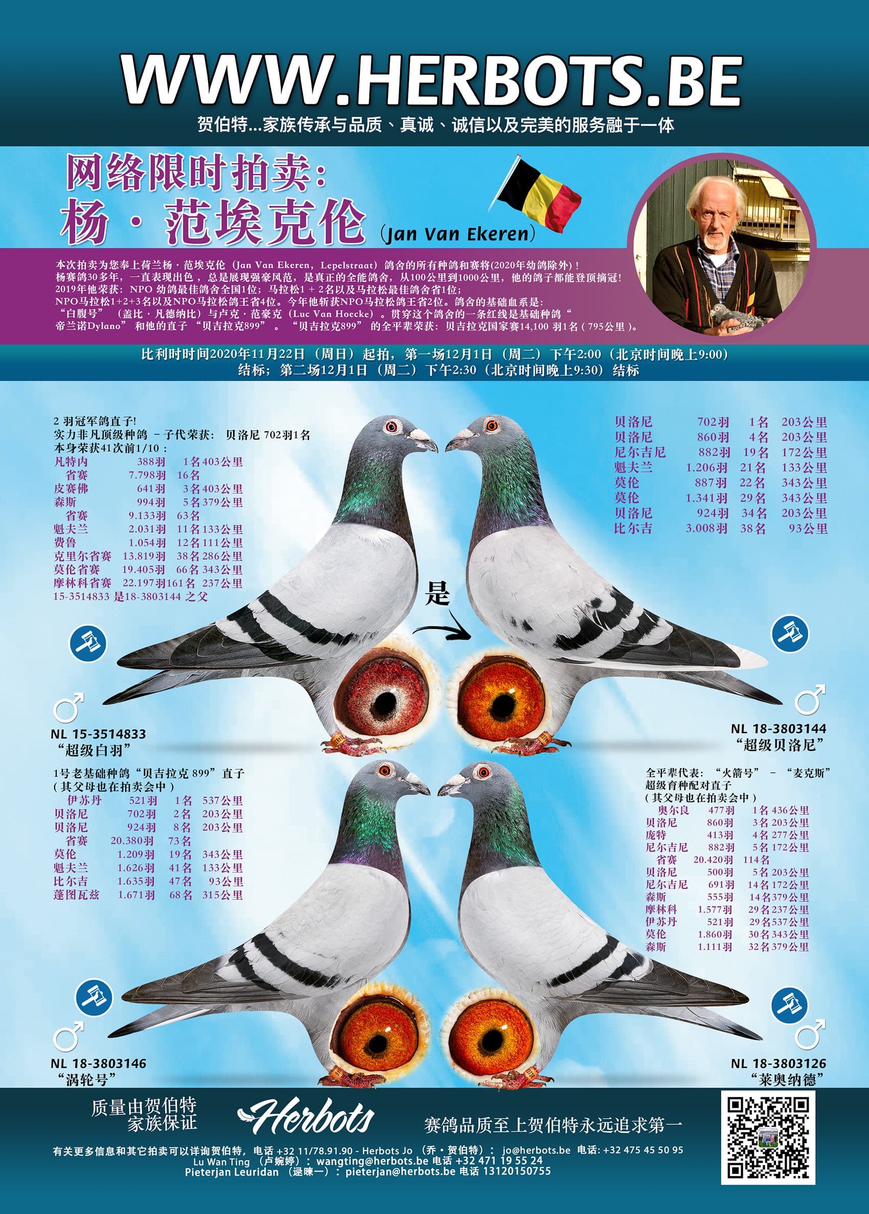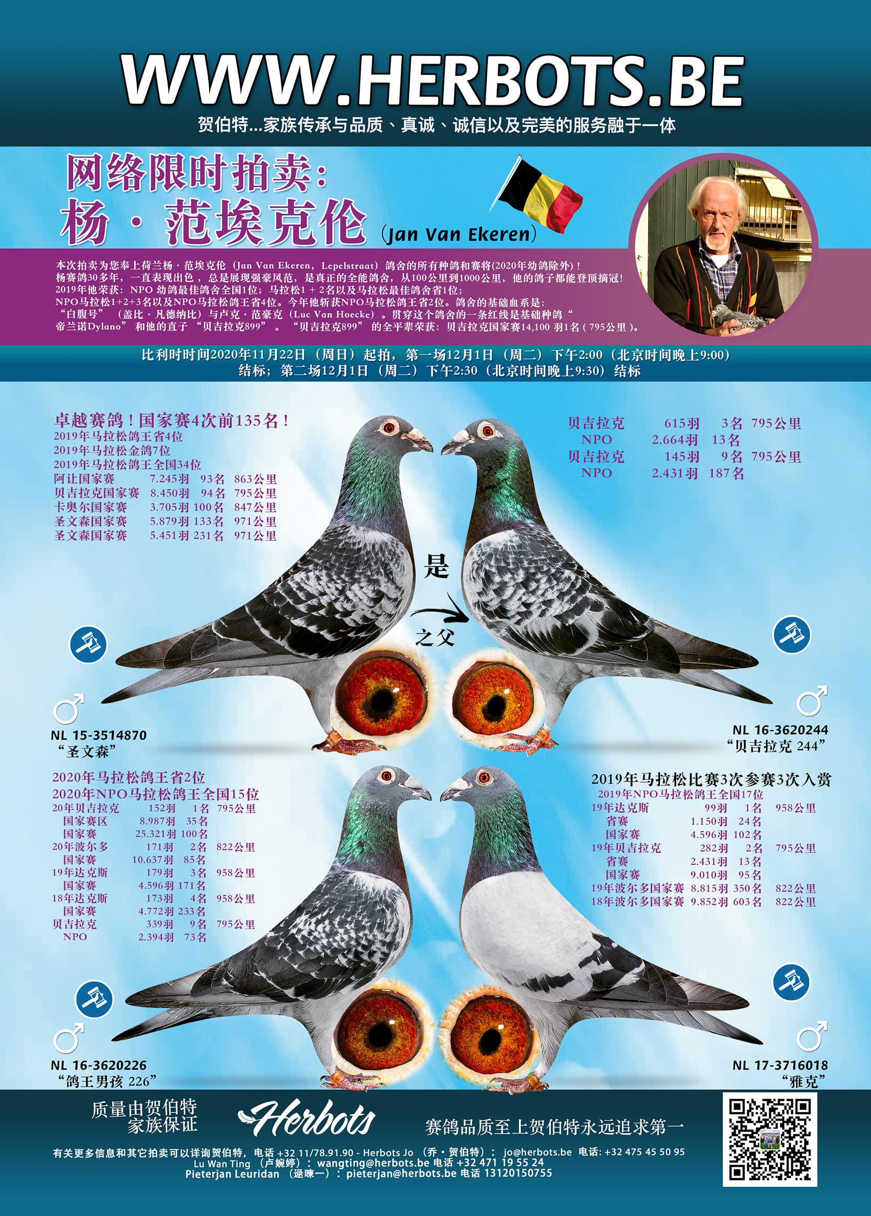 本次拍卖为您奉上荷兰杨·范埃克伦(Jan Van Ekeren,Lepelstraat)鸽舍的所有种鸽和赛将(2020年幼鸽除外) !杨赛鸽30多年,一直表现出色 ,总是展现强豪风范,是真正的全能鸽舍,从100公里到1000公里,他的鸽子都能登顶摘冠!2019年他荣获:NPO 幼鸽最佳鸽舍全国1位;马拉松1 + 2名以及马拉松最佳鸽舍省1位;NPO马拉松1+2+3名以及NPO马拉松鸽王省4位。今年他斩获NPO马拉松鸽王省2位。鸽舍的基础血系是: “白腹号” (盖比·凡德纳比)与卢克·范豪克(Luc Van Hoecke。贯穿这个鸽舍的一条红线是基础种鸽“帝兰诺Dylano” 和他的直子 “贝吉拉克899” 。 “贝吉拉克899” 的全平辈荣获:贝吉拉克国家赛14,100 羽1名 ( 795公里 )。