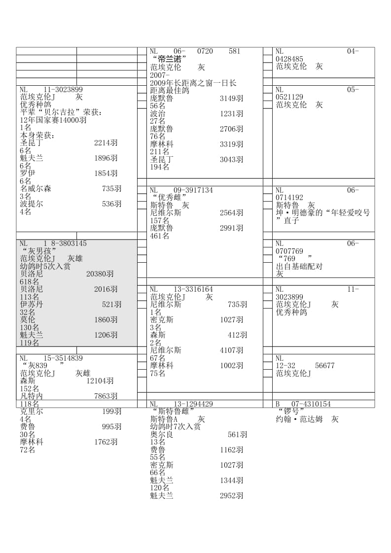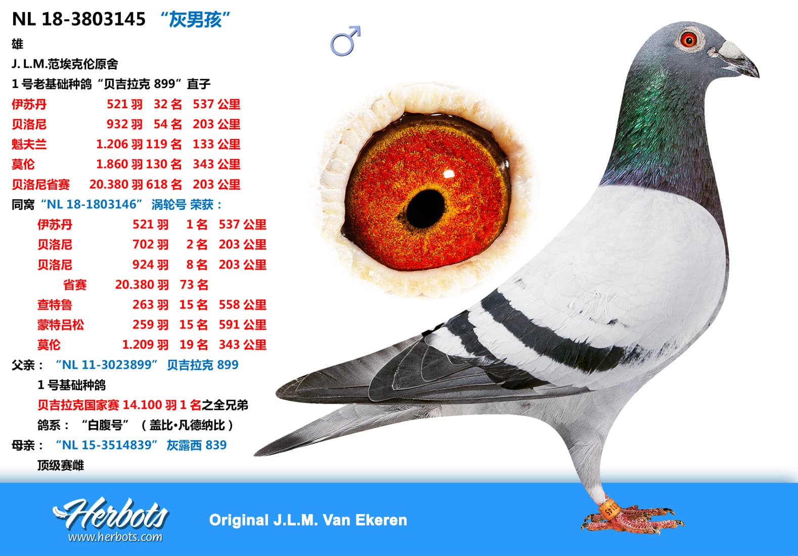 1号老基础种鸽“贝吉拉克 899”直子伊苏丹 521羽 32名 537公里贝洛尼 932羽 54名 203公里贝洛尼省赛 20.380羽618名 203公里同窝“NL 18-1803146” 涡轮号 荣获: 伊苏丹 521羽 1名 537公里贝洛尼 702羽 2名 203公里贝洛尼 924羽 8名 203公里 省赛 20.380羽 73名莫伦 1.209羽 19名 343公里