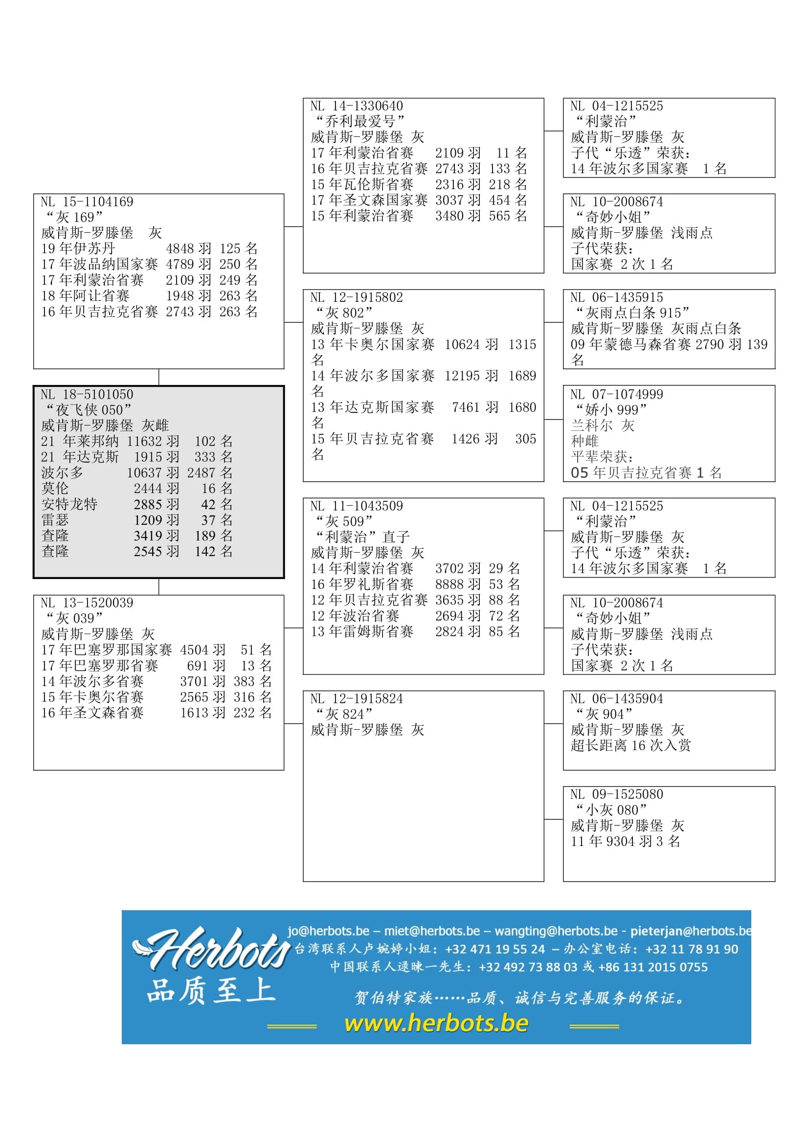 利蒙治省赛 3,702羽29名 – 罗礼斯省赛 8888羽53名 – 贝吉拉克省赛 3,635羽88名- 波治省赛 2,694羽72名 – 雷姆斯省赛2,824羽85名