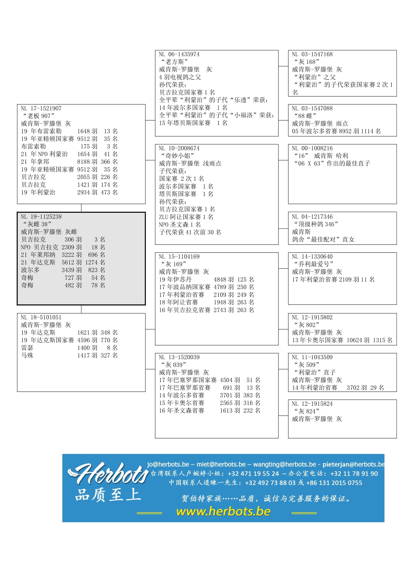 “NL15-1104169” (荣获: 伊苏丹 4,848羽125名– 波品纳国家赛 4,789羽250名 ) x “NL13-1520039” (荣获: 17年巴塞罗那国家赛 4,504羽51名 )作出