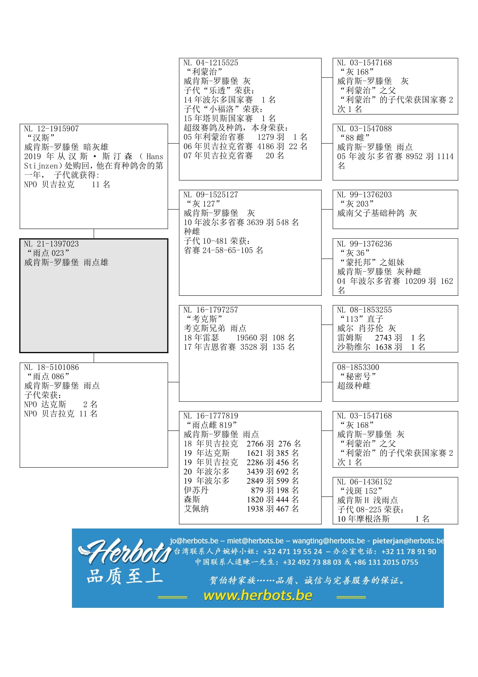 利蒙治省赛 1,279羽1名;“利蒙治”子代代表:“乐透” (14年波尔多国家赛1名) 和“小福洛” (15年塔贝斯国家赛1名)