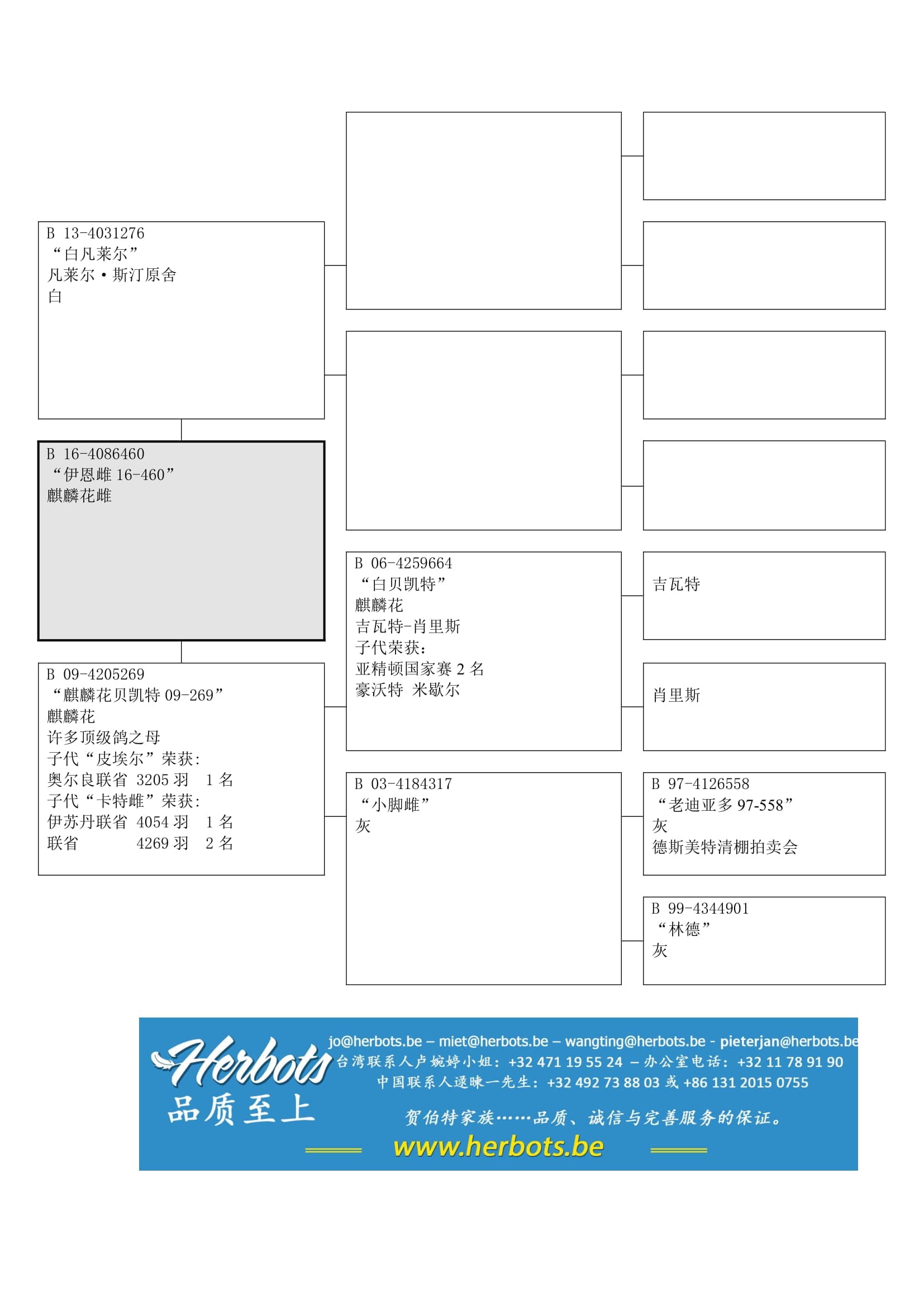 母亲: “B09-4205269” – 贝凯特 子代代表及佳绩: “卡特雌”: 伊苏丹联省 4,054羽1名 “皮埃尔”: 奥尔良联省 3,205羽1名荣获 亚精顿国家赛2名 @豪沃特 米歇尔