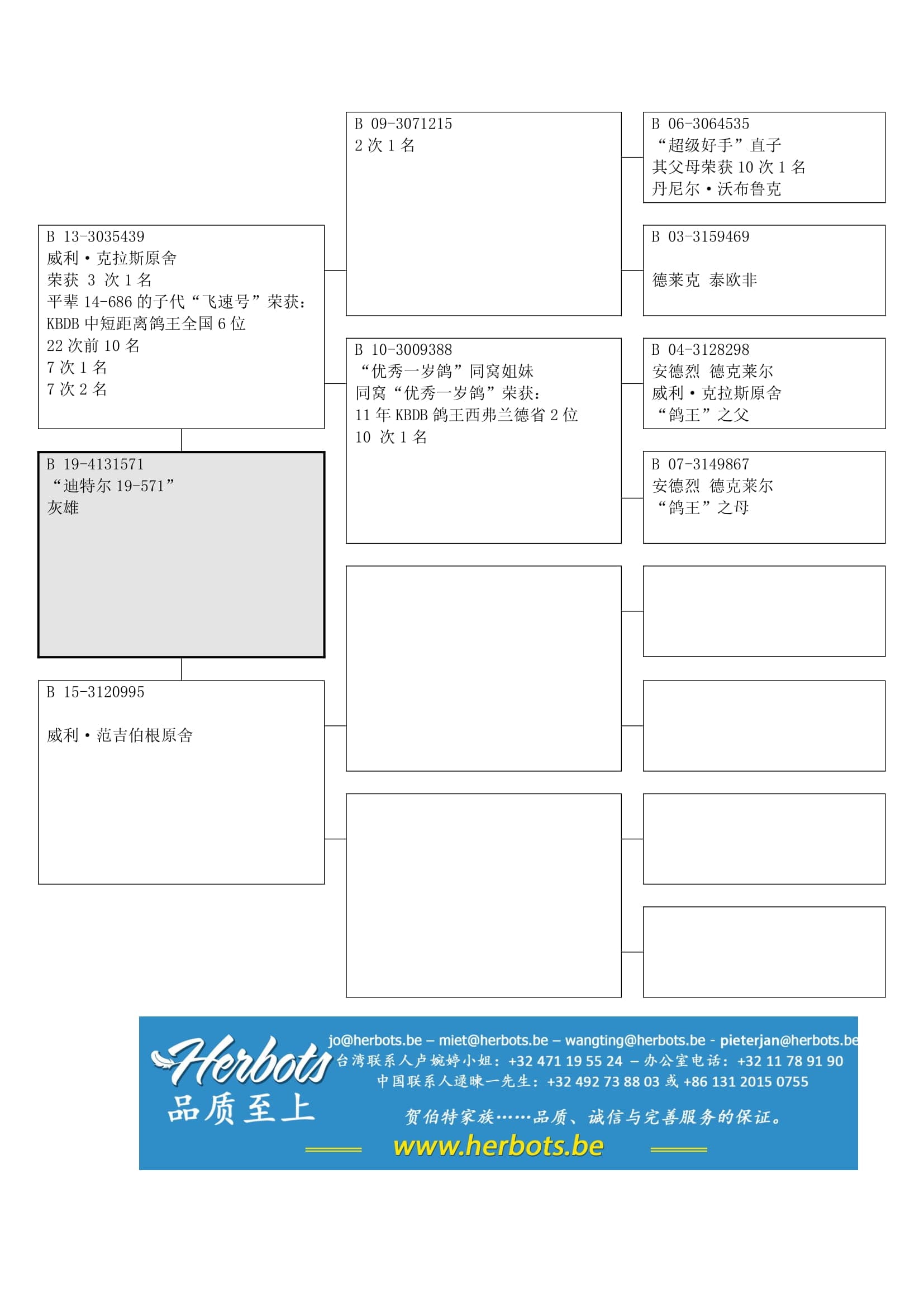 父亲: “B13-3035439”- 威利·克拉斯原舍荣获 3 次1名平辈的子代荣获: KBDB中距离鸽王全国6位 “B09-3071215” x “B10-3009388”直子“B09-3071215”荣获 2 次1名“B10-3009388”同窝“优秀一岁鸽”荣获: