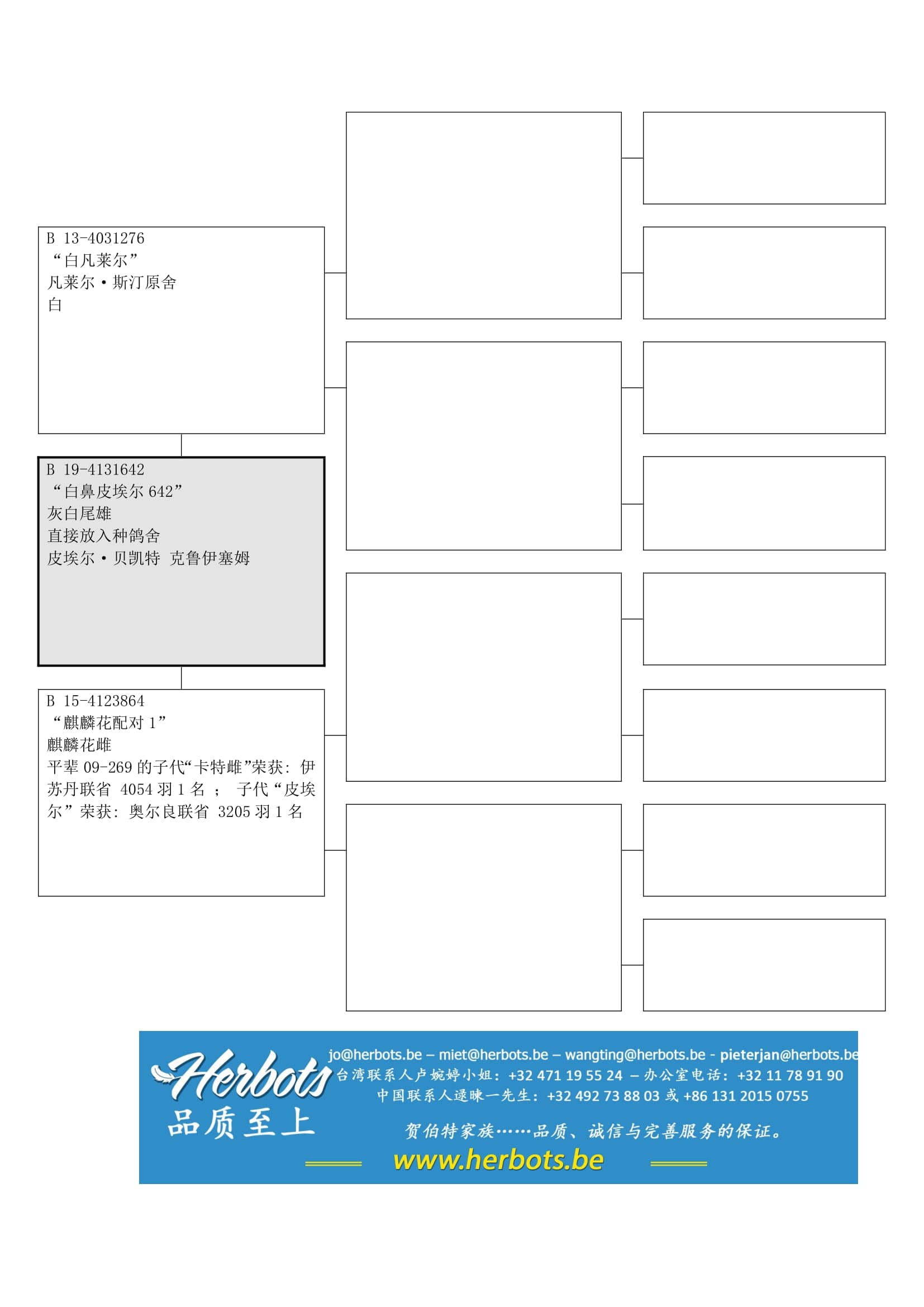 母亲: 麒麟花配对 1” B15-4123864全平辈的子代“卡特雌”荣获: 伊苏丹联省 4,054羽1名 ; 子代“皮埃尔”荣获: 奥尔良联省 3,205羽1名