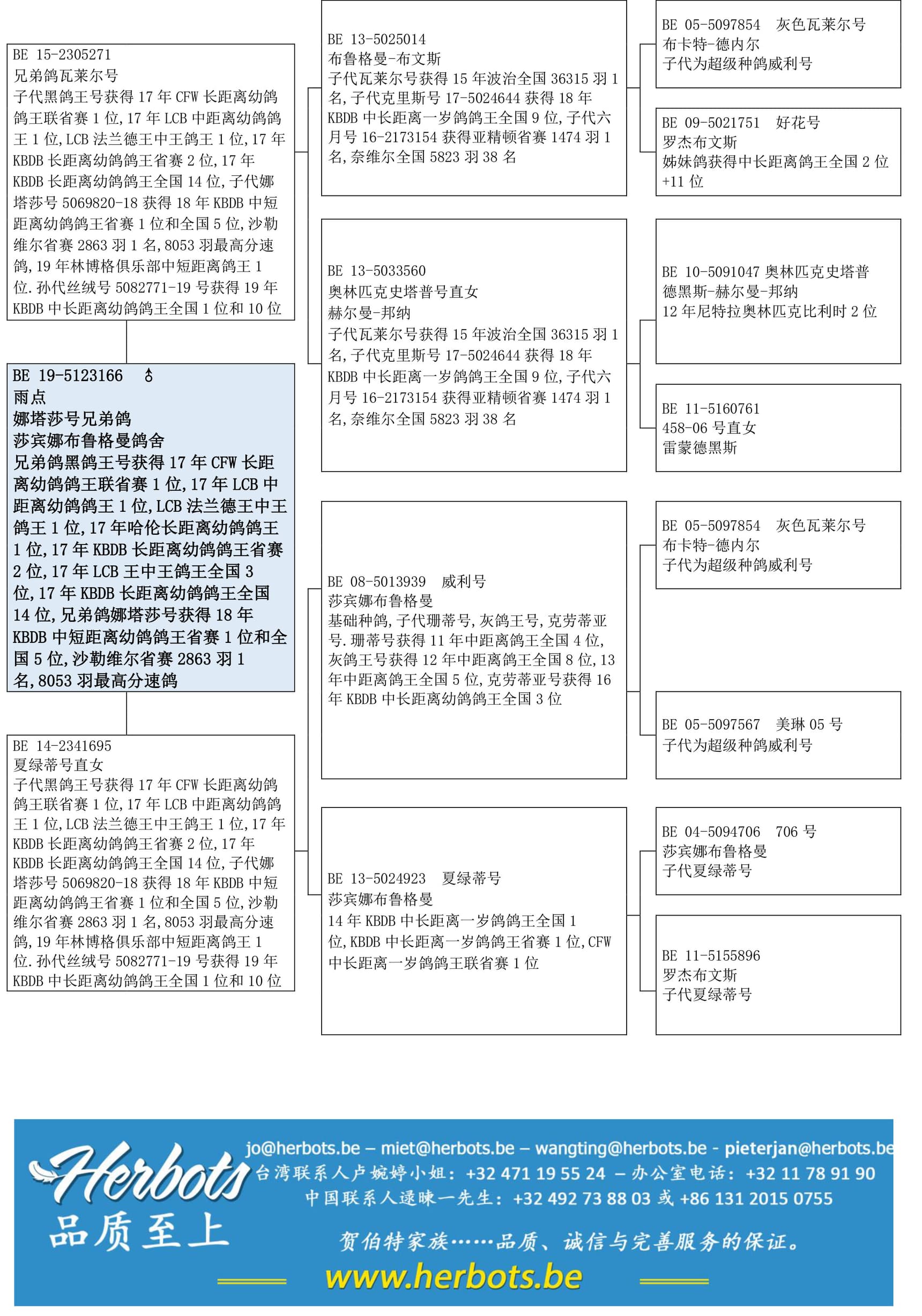 全平辈 “娜塔莎”荣获:18年KBDB中距离鸽王全国5位 – 舍雷省赛 2,863羽1名 ( 8,053羽分速最高) – 苏顿 994羽2名全平辈 “黑鸽王” 荣获:17年CFW长距离鸽王联省1位 – 2017年KBDB长距离鸽王全国14位其祖辈 “夏洛特”荣获:2014年KBDB中长距离一岁鸽王全国1位
