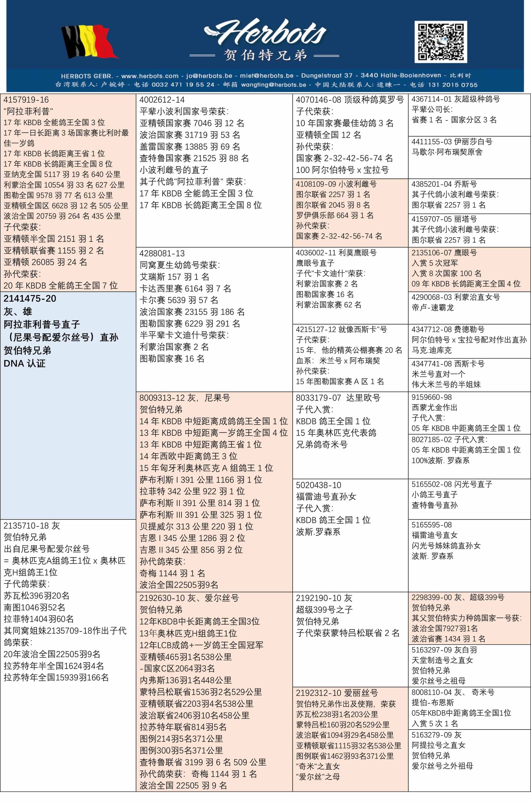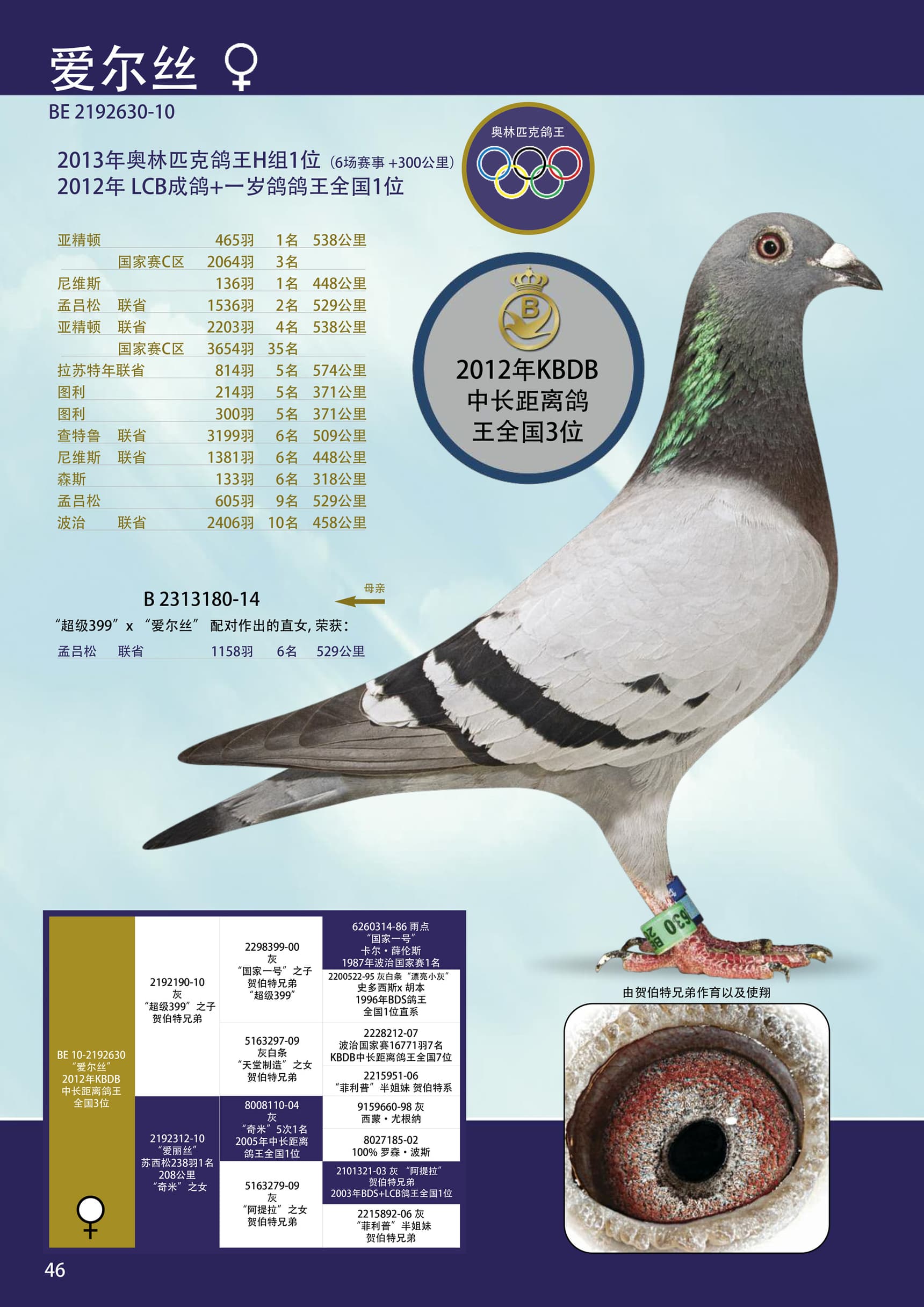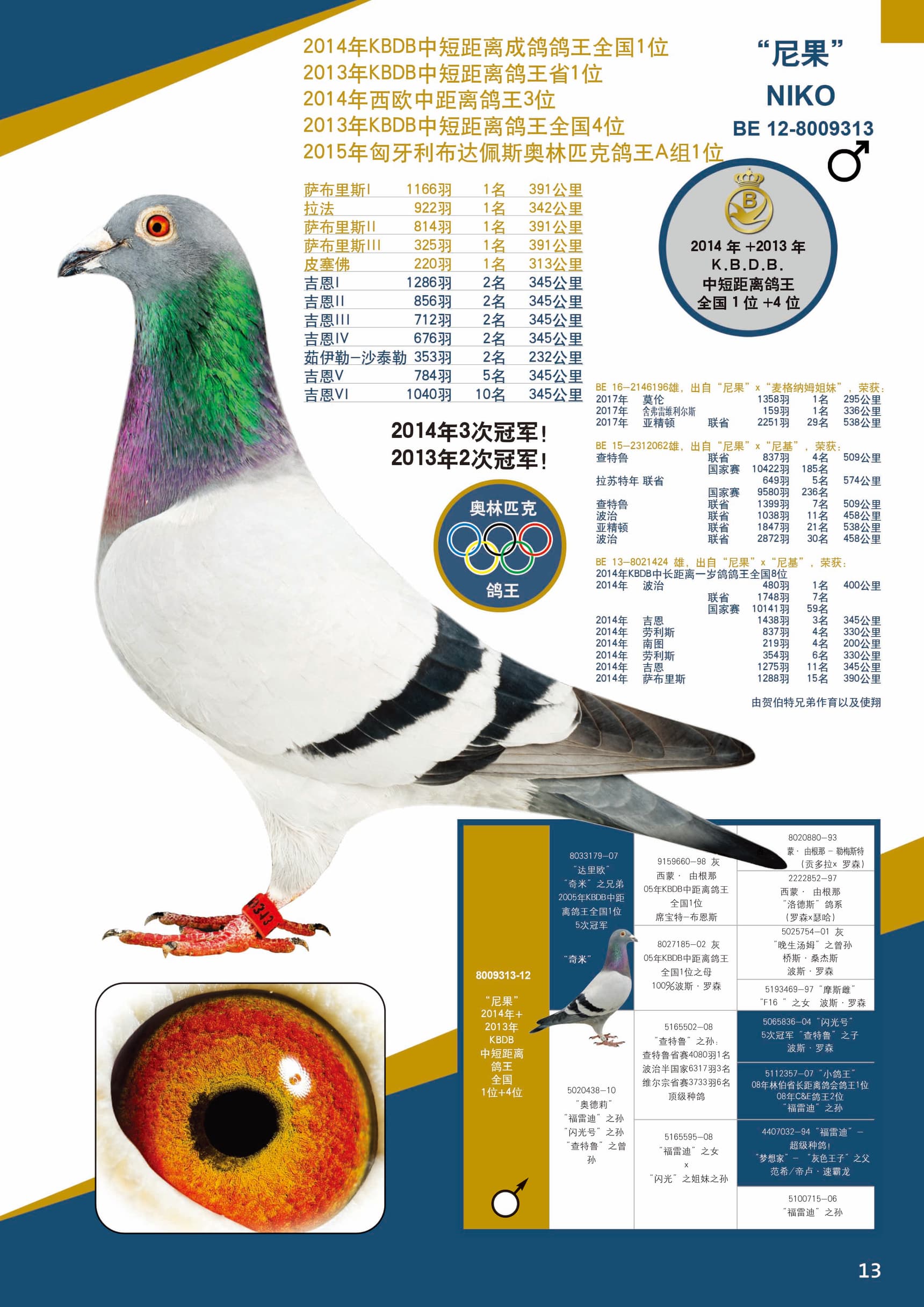 13年奥林匹克H组鸽王1位(5场国家赛超过300公里)