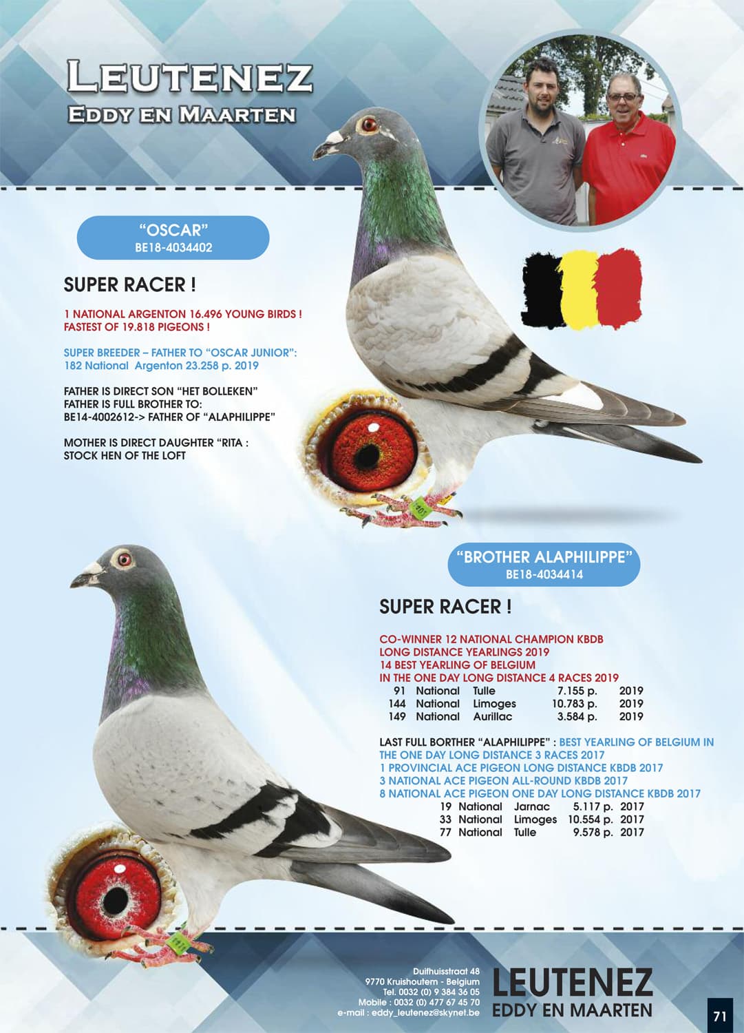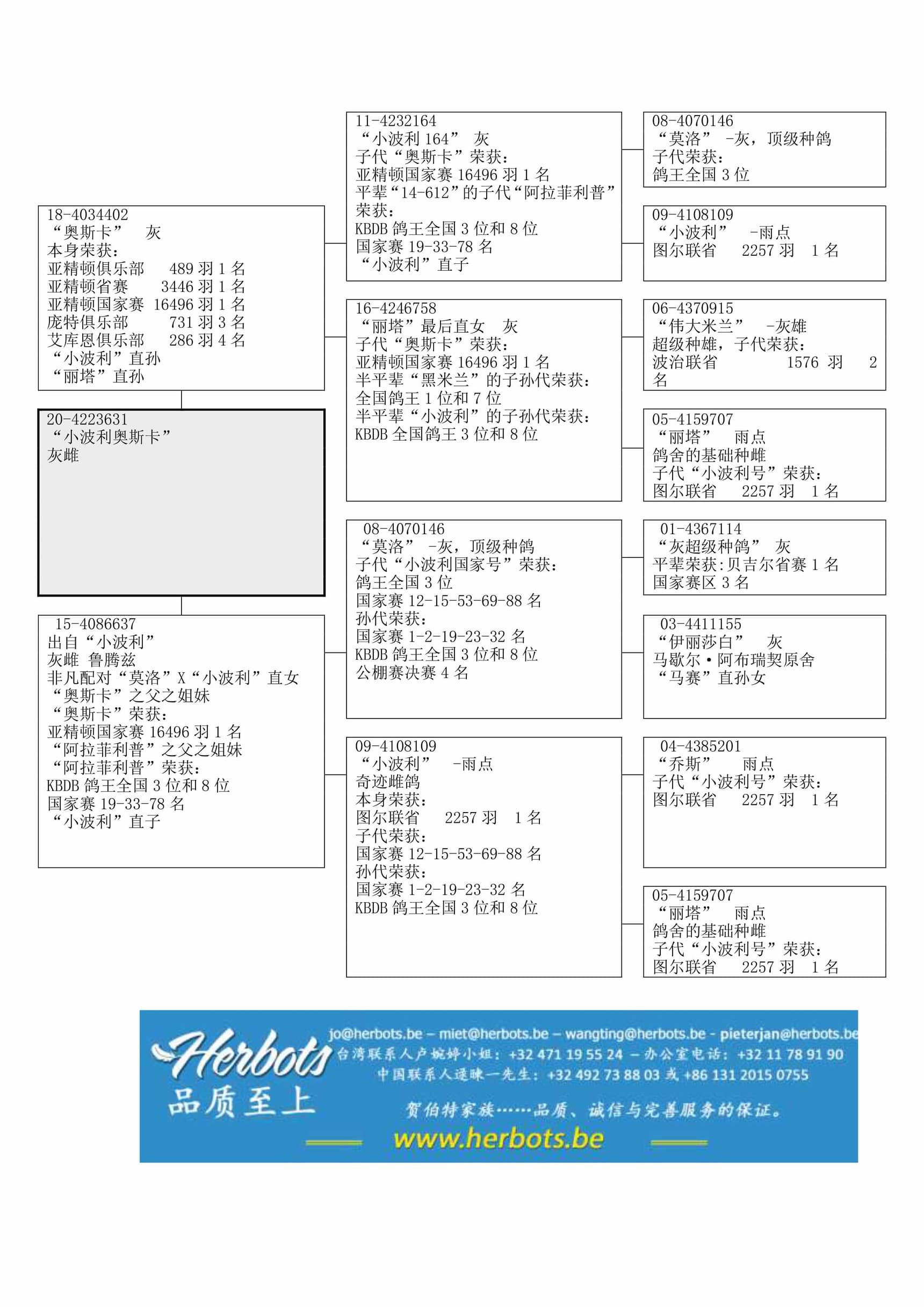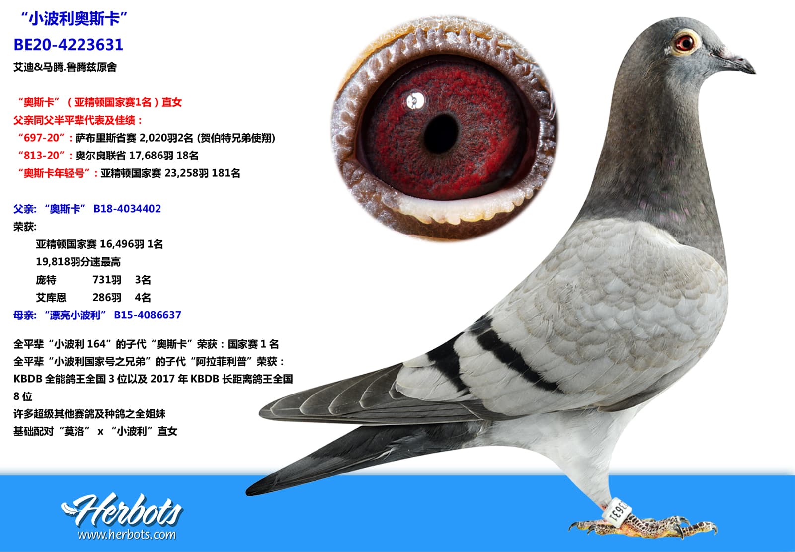“奥斯卡”(亚精顿国家赛1名)直女 父亲同父半平辈代表及佳绩: “697-20”: 萨布里斯省赛 2,020羽2名 (贺伯特兄弟使翔)“813-20”: 奥尔良联省 17,686羽 18名“奥斯卡年轻号”: 亚精顿国家赛 23,258羽 181名