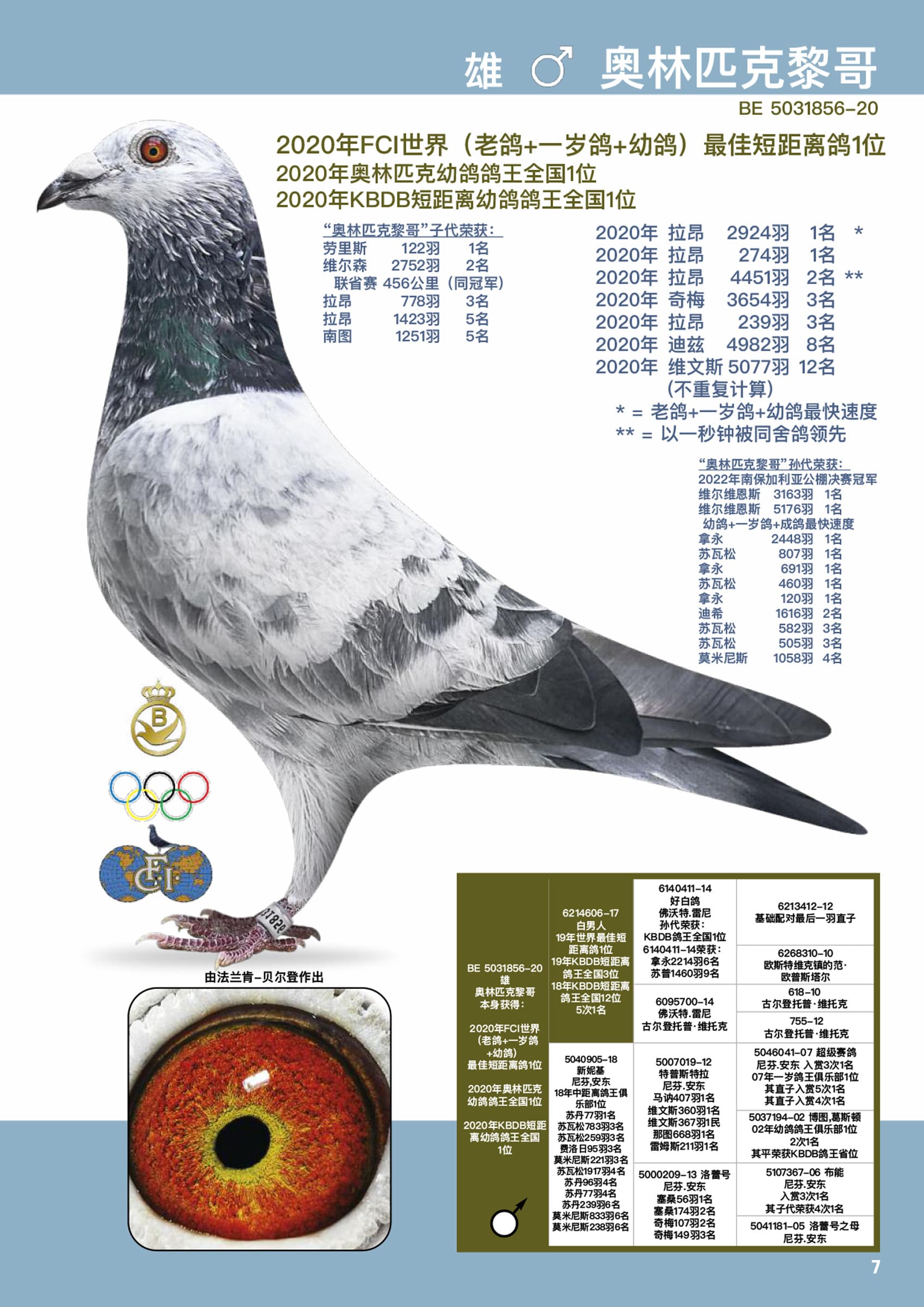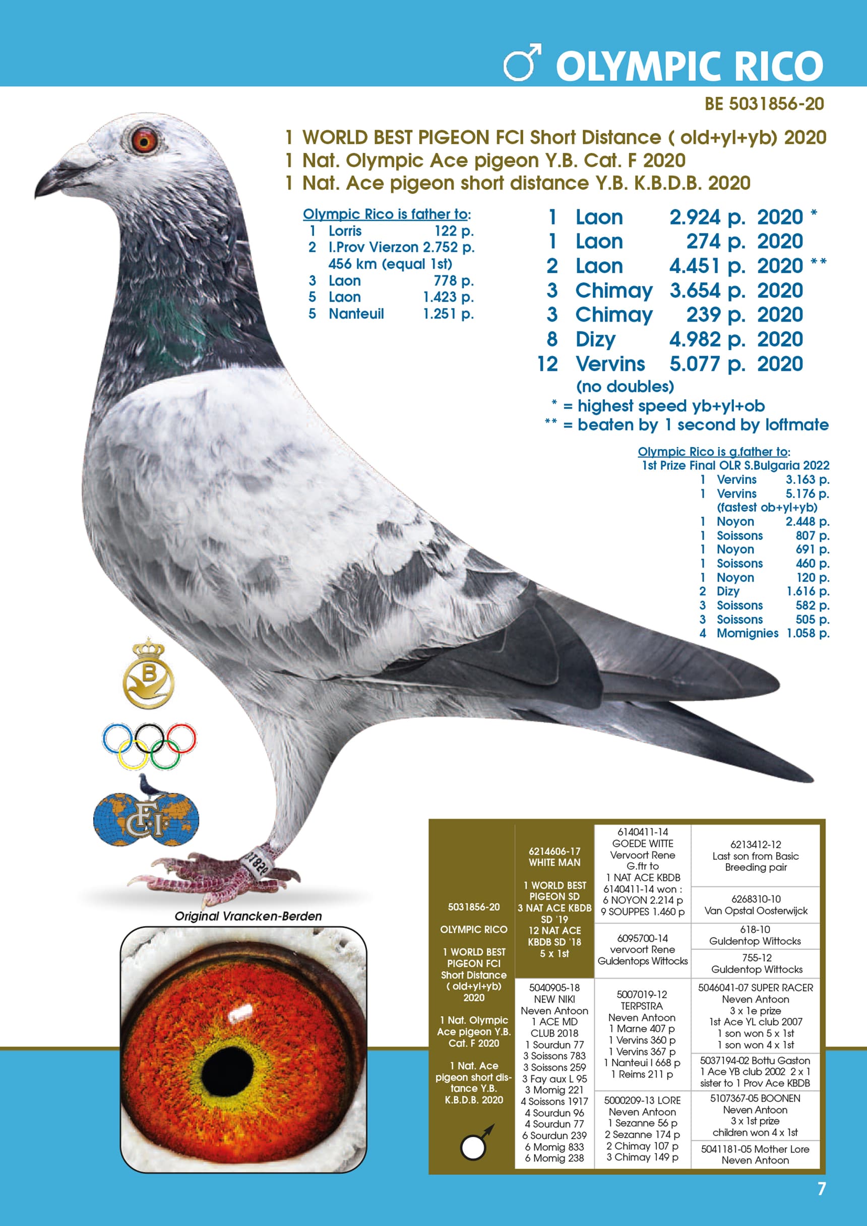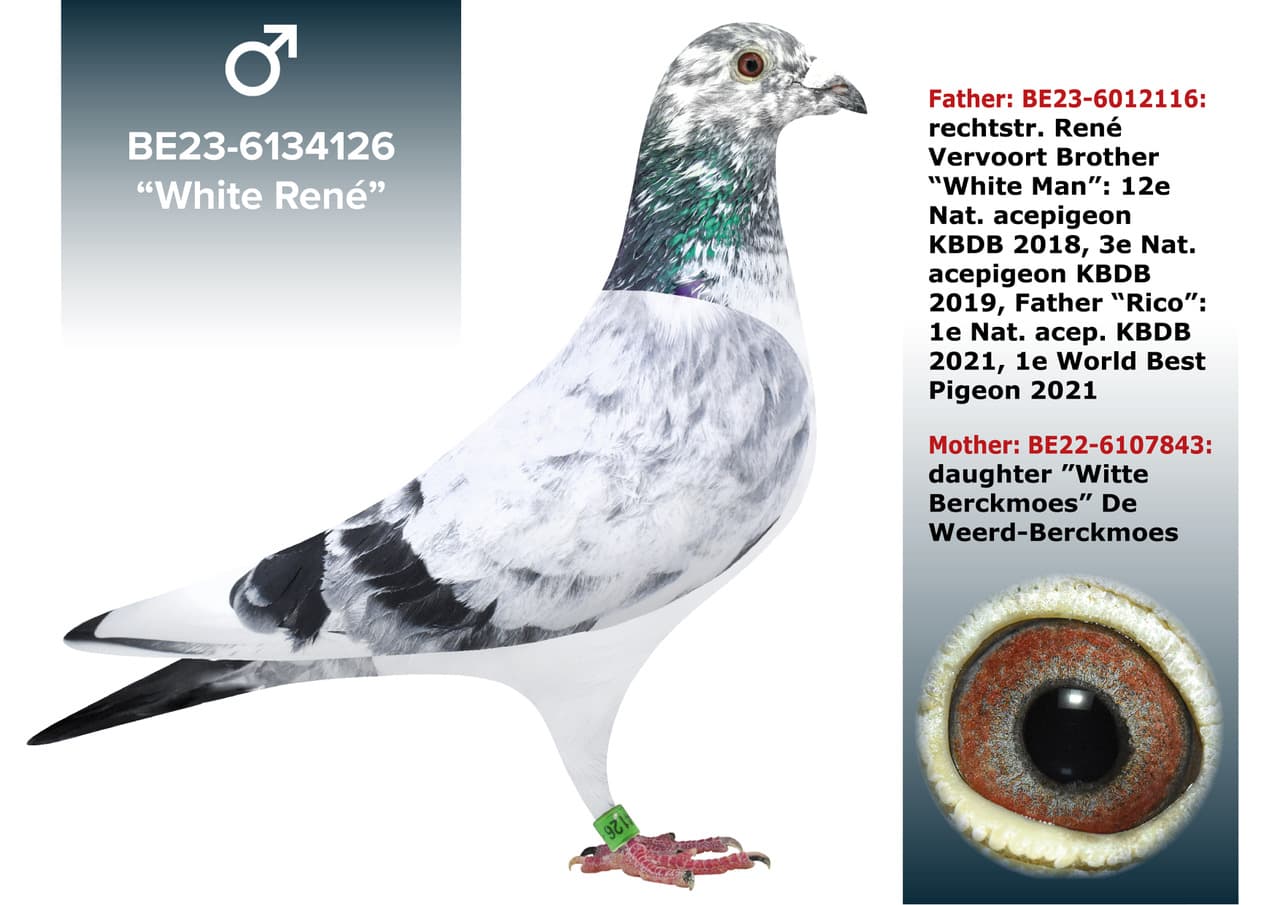 Father:BE23-6012116 René Vervoort Brother “White Man”:12e Nat. acepigeon KBDB 2018, 3e Nat. acepigeon KBDB 2019, Father “Rico”:1e Nat. acep. KBDB 2021, 1e World Best Pigeon 2021