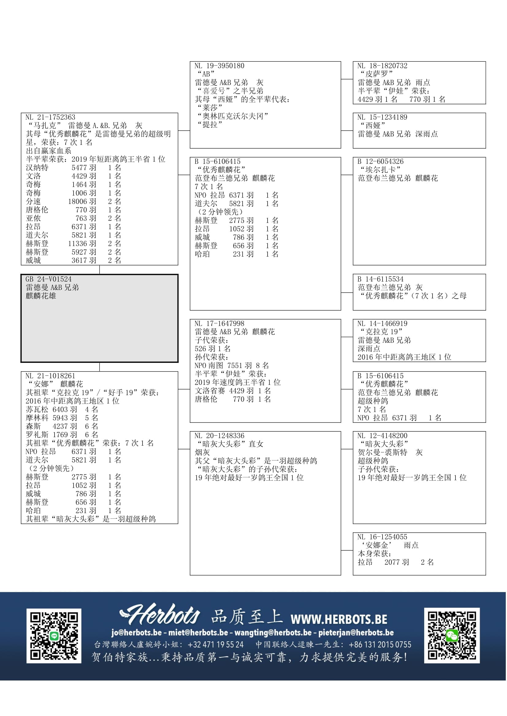 荣获 7次1名;后代荣获: 24年奥林匹克G类鸽王