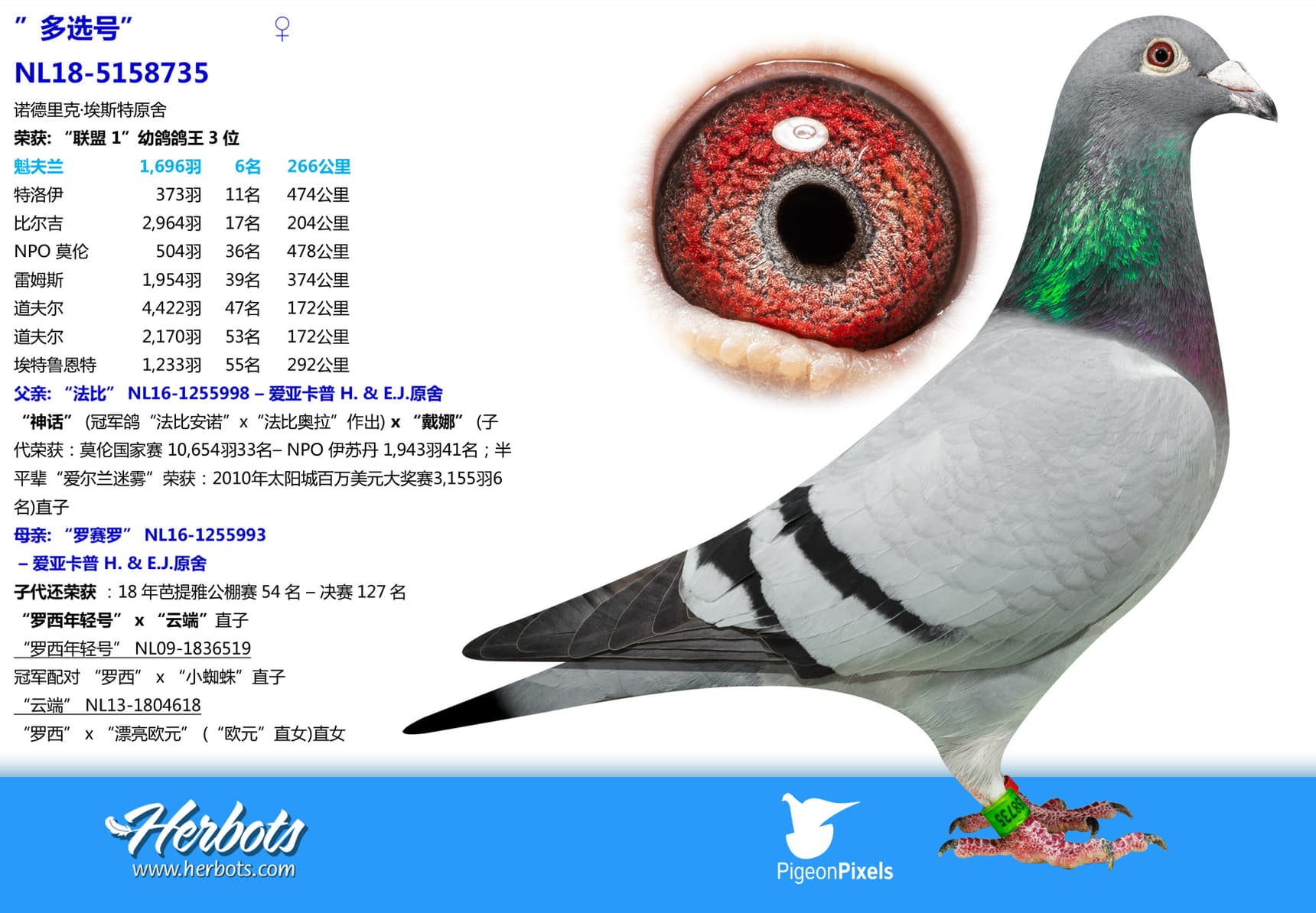 “神话” (冠军鸽“法比安诺”x“法比奥拉”作出) x “戴娜” (子代荣获:莫伦国家赛 10,654羽33名– NPO 伊苏丹 1,943羽41名;半平辈“爱尔兰迷雾”荣获:2010年太阳城百万美元大奖赛3,155羽6名)直子
