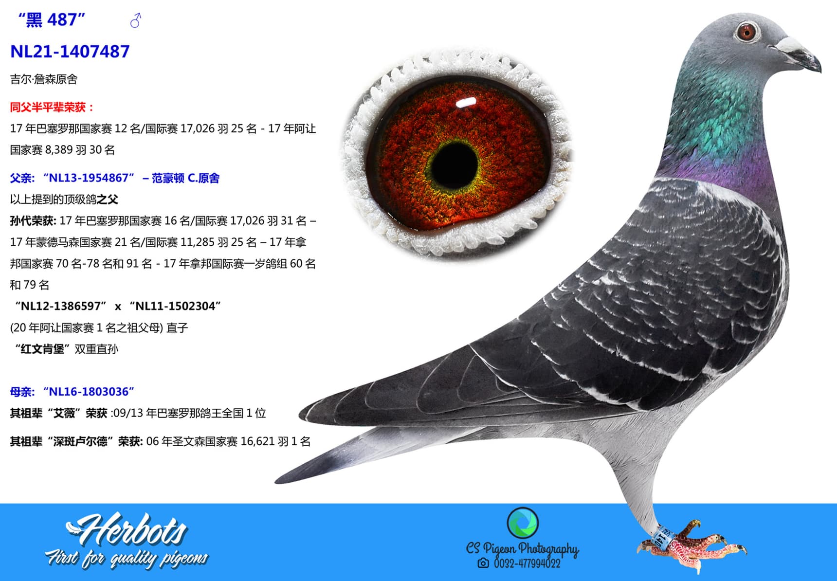 其祖辈“艾薇”荣获 :09/13年巴塞罗那鸽王全国1位