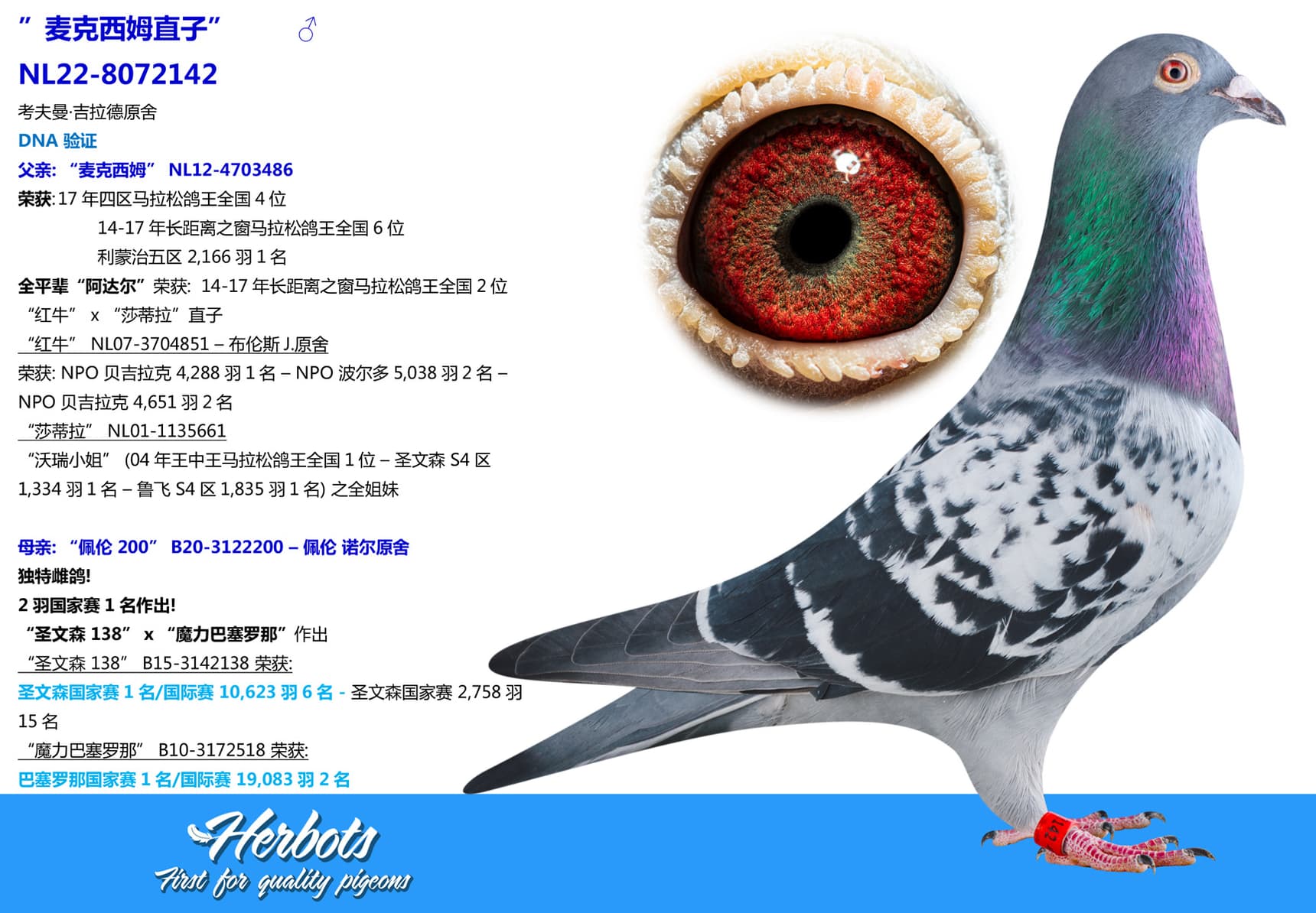 “沃瑞小姐” (04年王中王马拉松鸽王全国1位 – 圣文森 S4区1,334羽1名 – 鲁飞 S4区1,835羽1名) 之全姐妹